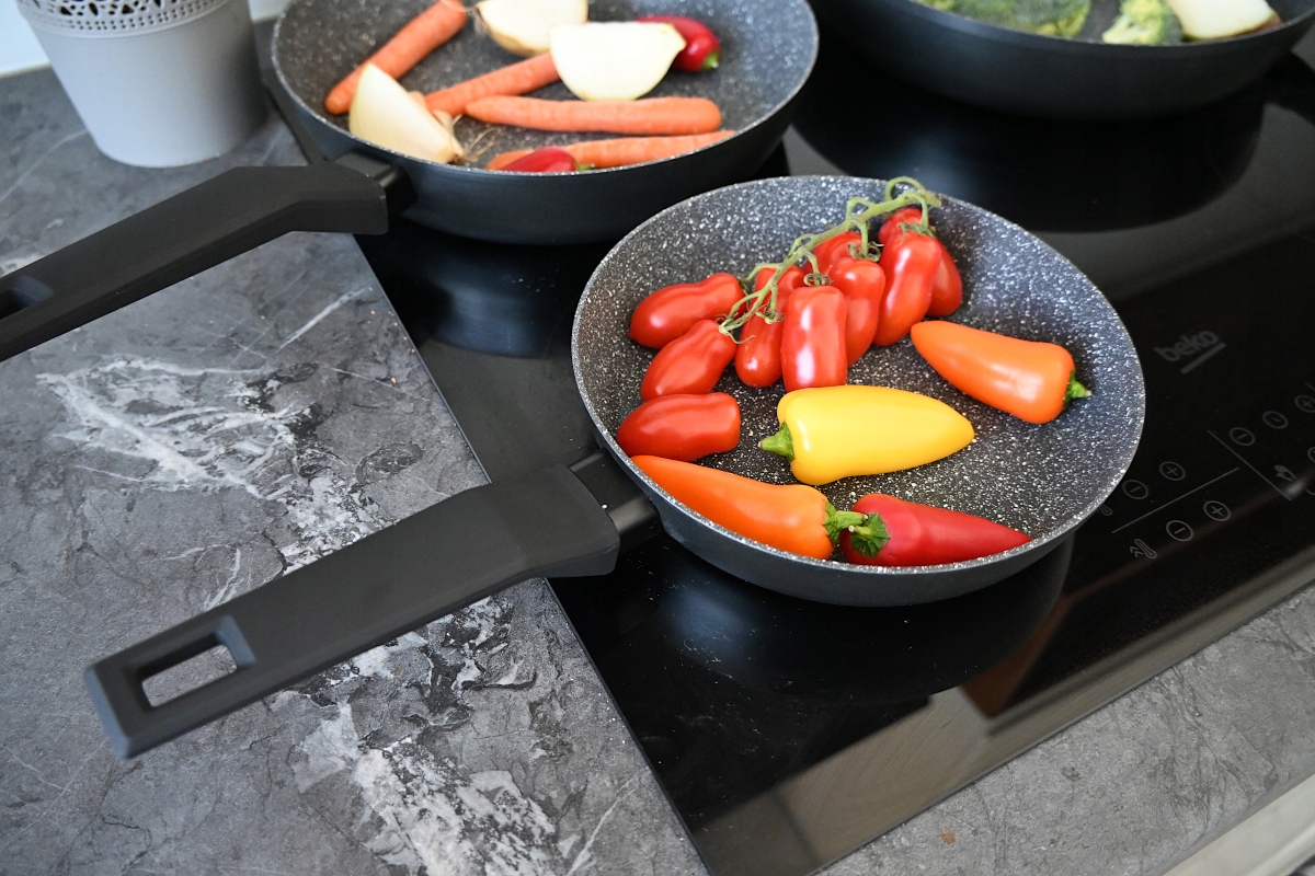 Різні розміри: наш набір включає 3 різні розміри каструль (20/26/30 см), які дозволяють готувати різні страви розміри. Від смаження яєць на сніданок до приготування смачних обідів для всієї родини – ці сковорідки універсальні.