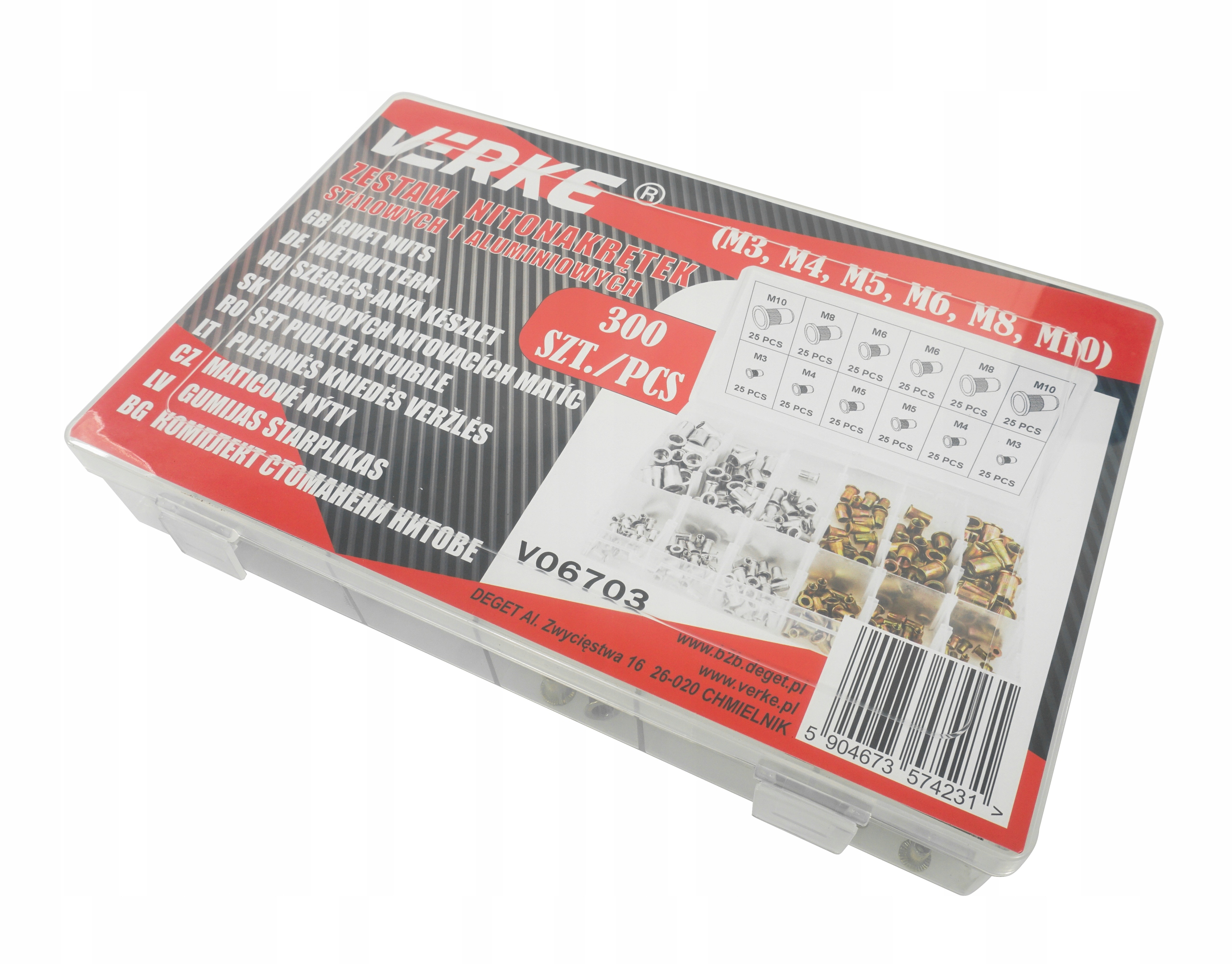 набір verke nitonacate - чудове рішення для тих, хто потребує надійних та універсальних інструментів для комбінування матеріалів. Він містить 300 штук Nitonachats у різних розмірах (від m3 до m10 ), що дозволяє використовувати їх у широкому діапазоні встановлення , ремонт та конструкції . Ці заклепи виготовлені з високоякісних матеріалів , що забезпечує їм довговічність та у використанні.