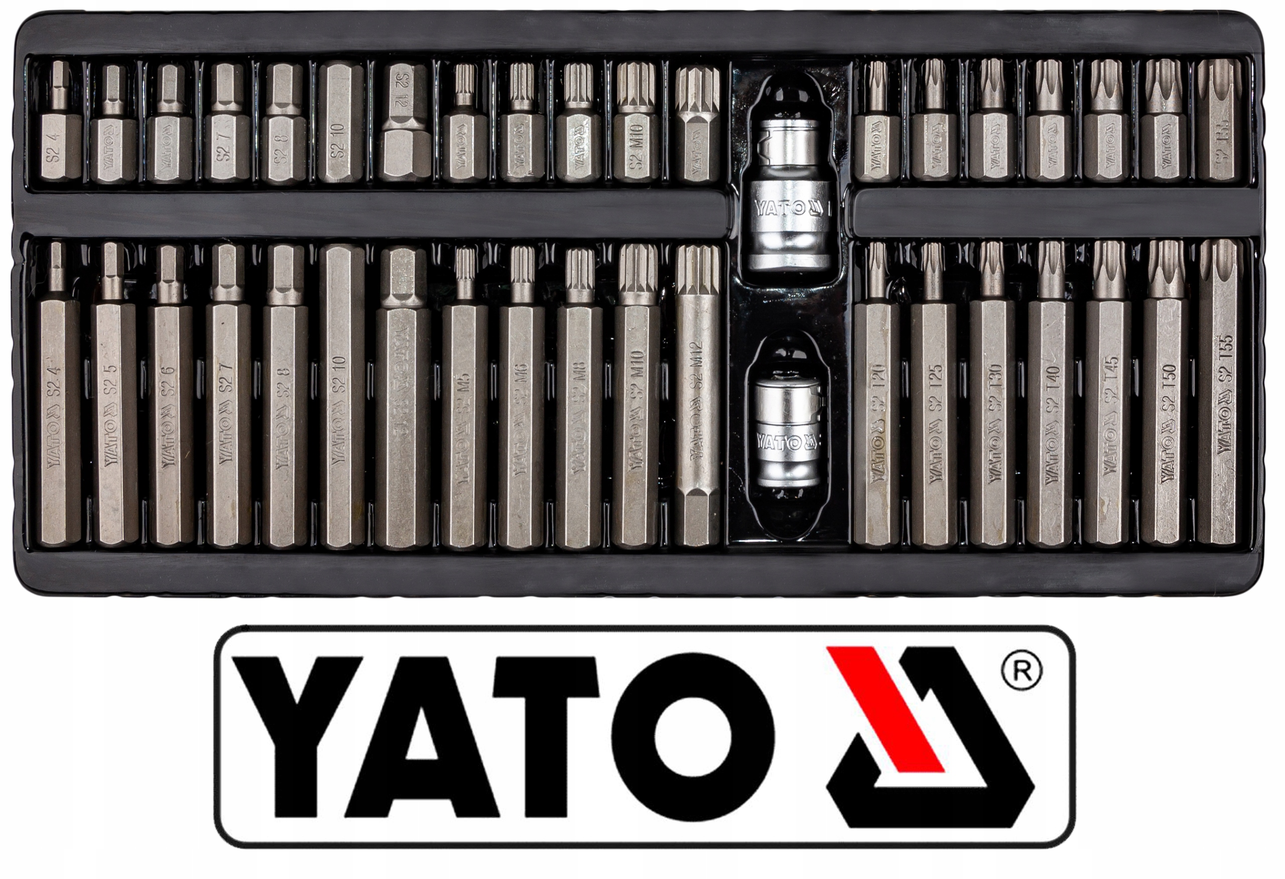 Набір біт YATO, використовується для відкручування спеціальних гвинтів, таких як шестигранник, торкс, шлицевий. Різноманітність насадок дозволяє виконувати багато робіт в спеціалізованих механічних і автосервісах. Наконечники мають дві довжини: 30 і 75 мм, встановлені в шестигранний тримач 10 мм, адаптований для роботи з тріскачкою 1/2" і 3/8".