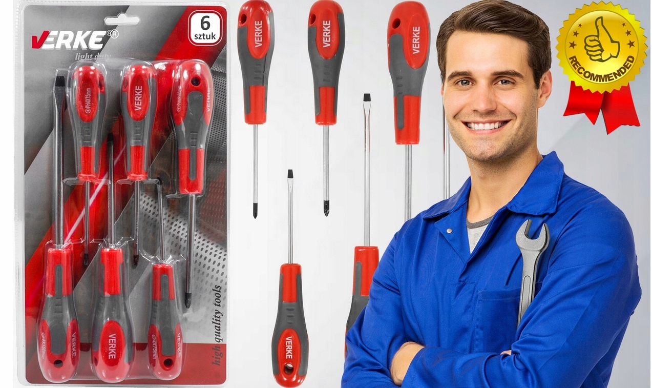 Набір викруток, виготовлених із сталі хрому-ванадію (CRV). Ергономічна ручка забезпечує певне зчеплення інструменту та гарантує ефективну та точну роботу. Набір складається з трьох плоских викруток і трьох поперечних філіпсів. Розміри викруток були обрані таким чином, щоб вони відповідали гвинтам, що використовуються в кожному будинку та майстерні.