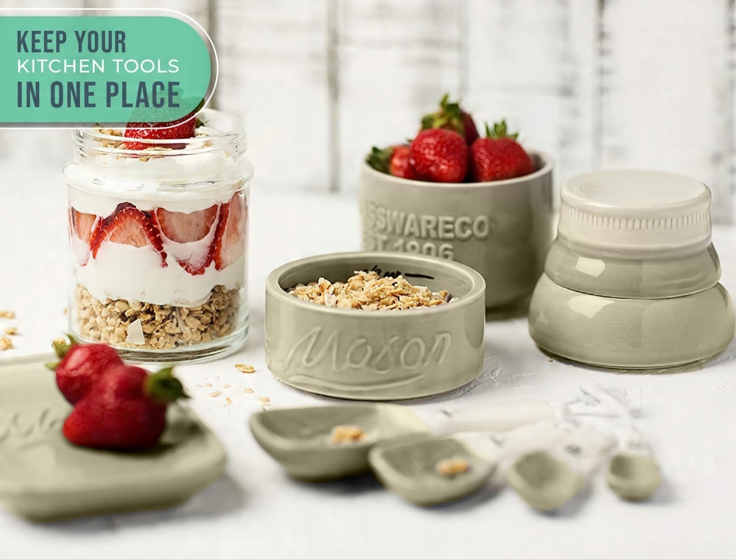 - Найкорисніші розміри – керамічні мірні ложки розміром ¼ чайної ложки, ½ чайної ложки, 1 чайна ложка та 1 столова ложка; розміри мірних чашок: ¼ чашки, 1/3 чашки, ½ чашки та 1 чашка; Тримач ложки достатньо великий для будь-яких розмірів кухонних ложок.