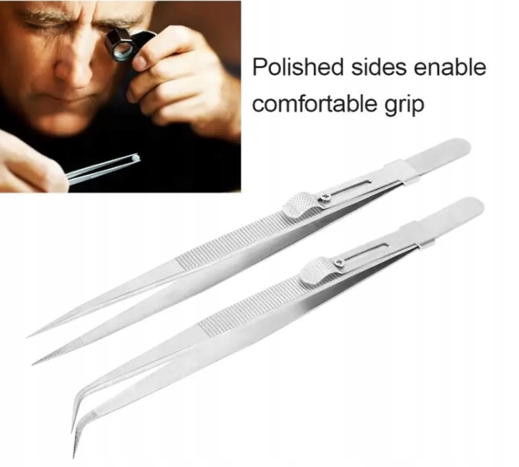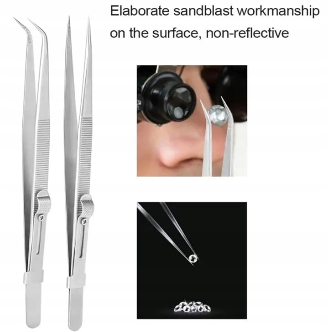 Вміст: 2 пінцет з нержавіючої сталі (1 прямий, 1 вигнутий) та 2 пронизливі кульки (1 срібло, 1 чорний). благородні, маленькі гвинти та інші точні роботи.