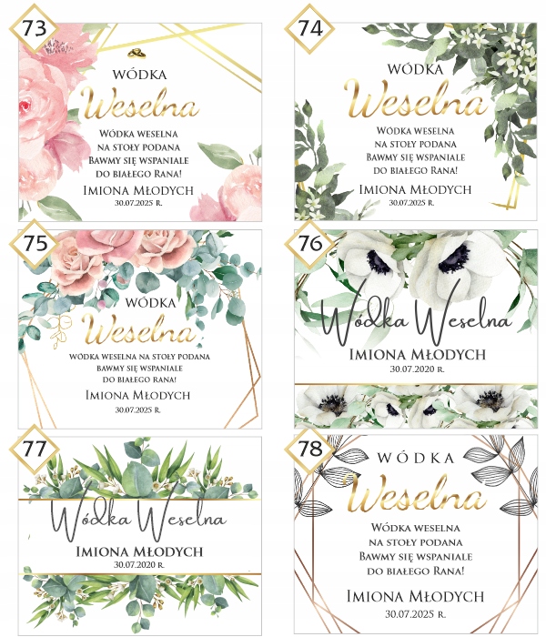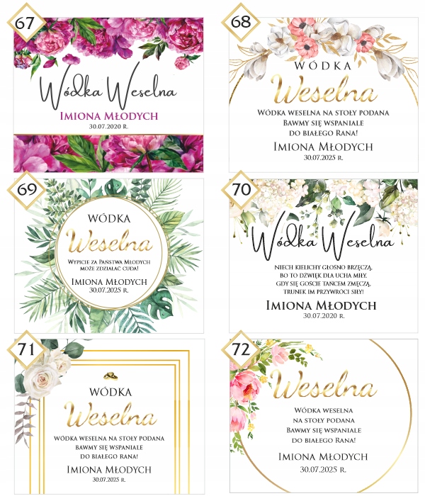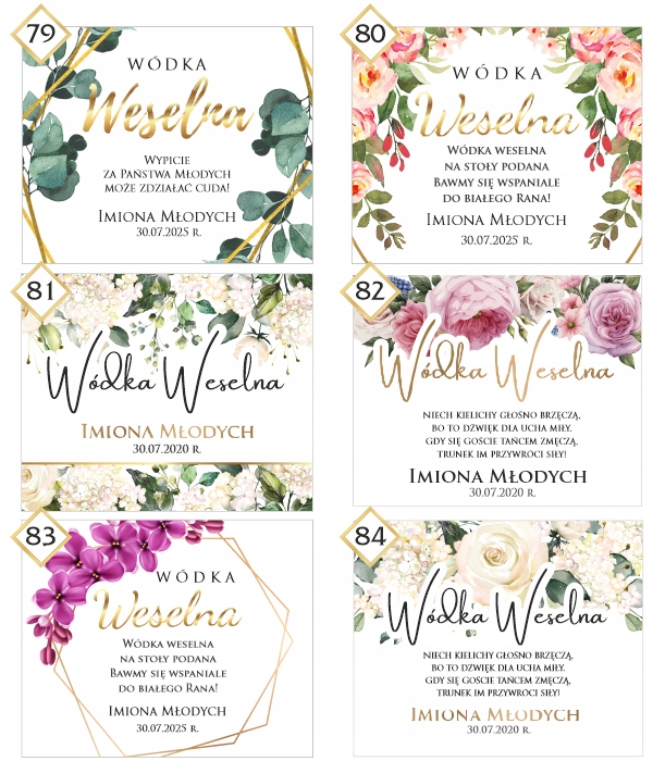Наклейки для горілки Biały Bocian, 0,5 л, з іменами та датою весілля нареченого та нареченої . Цифровий друк наклейок на фользі, що гарантує відмінну якість друку та стійкість до охолодження в холодильнику, морозильній камері, холодильній камері тощо, іншими словами наклейка не плавиться, а відривається від пляшка після виймання з морозильної камери та подачі на весільний стіл. Розмір наклейки: 105 х 85 мм. У кожному дизайні можна додати окрему риму, змінити шрифт, змінити колір шрифту, змінити напис Wódka Weselna, наприклад, на Starostówka... Якщо у вас є власний дизайн, ми з радістю його надрукуємо для вас. , це не впливає на додаткові витрати. Ми можемо підготувати індивідуальний проект БЕЗКОШТОВНО. При замовленні 1 комплекту наклейок ви можете вибрати один дизайн, при замовленні 2 комплектів 2 дизайни... і т.д. Якщо є запитання, пишіть.