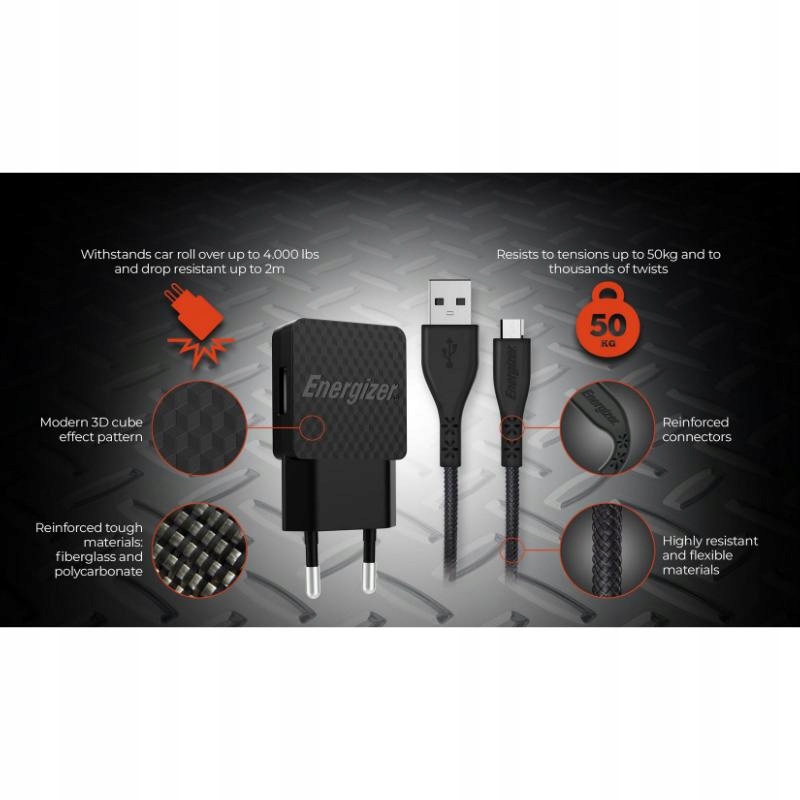 У набір входить 1 кабель USB-C і 1 кабель Micro USB. Він дуже гнучкий, міцний і стійкий до сплутування. Розроблений і виготовлений з використанням виключно міцних матеріалів, кабель серії Energizer HardCase витримує навантаження до 50 кг, що робить його одним з найміцніших кабелів такого типу на ринку. Посилена конструкція заглушок дозволяє без проблем згинати до 10 000 разів.
