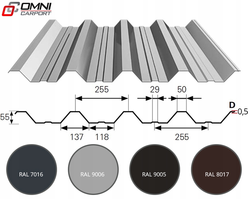 - Покриття даху: оцинкований трапецієподібний лист Т55, товщиною 0,5 мм, без антиконденсатного покриття з внутрішньої сторони. Доступний зовнішній колір: АНТРАЦИТОВИЙ RAL 7016, КОРИЧНЕВИЙ RAL 8017, СРІБЛИВИЙ RAL 9006, ЧОРНИЙ RAL 9005. Внутрішній колір: сіро-брудний, Можливість використання антиконденсатного покриття (ОПЦІЙНО).
