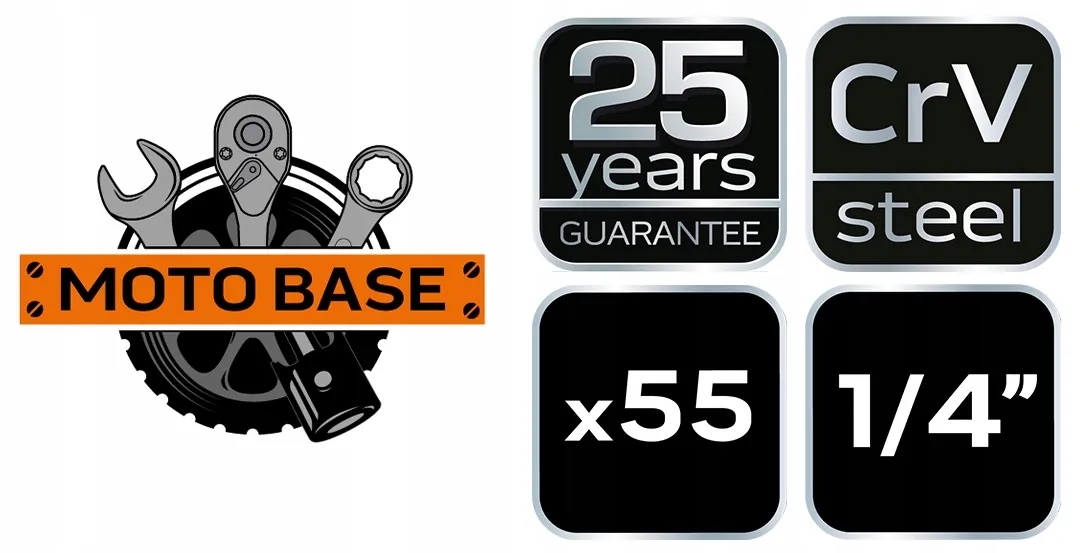 - Інші аксесуари: T-образна ручка 110мм, кардан, ручка викрутки, перехідник для викрутки, тріскачка 1/4" (72 шт.). зуби).