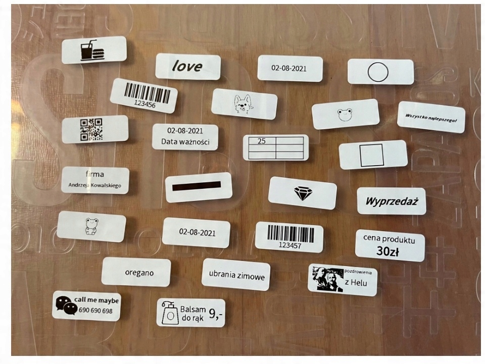 - Створення наклейок з багатьма елементами, такими як: зображення камери, QR -коди та інші, які генерують автоматично, лінії та інші форми, смайлики та готові логотипи, а також з поточним часом та датою.