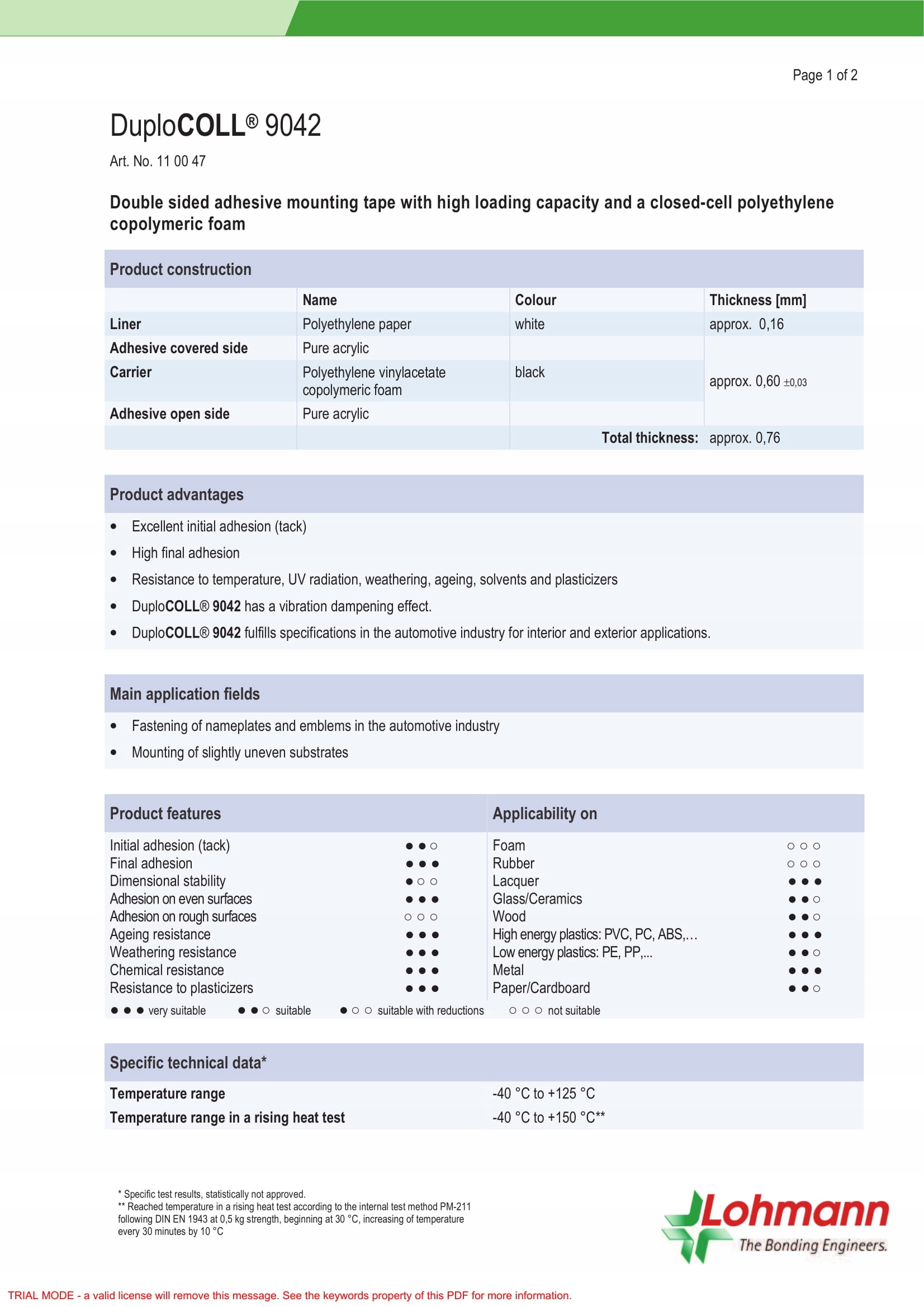 Висока початкова сила склеювання, висока кінцева сила склеювання.