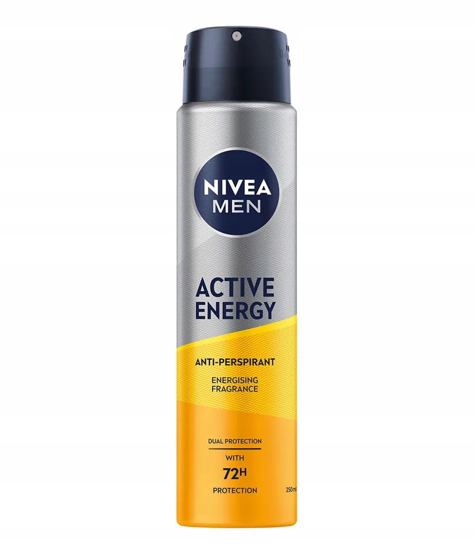 Антиперспірант NIVEA MEN Active Energy забезпечує надійний захист від вологи під пахвами та неприємного запаху поту. Унікальна формула з комплексом цинку та активними речовинами, які захищають навіть у найстресовіших ситуаціях. Бореться з компонентами поту з різними запахами, захищаючи вас від неприємного запаху тіла протягом 72 годин. Водночас активна енергія NIVEA дбайливо доглядає за шкірою під пахвами. Active Energy — це сильний, енергійний і чоловічий аромат з унікальним ароматичним деревним характером, який залишиться з вами надовго. Верхня нота поєднує іскристі цитрусові зі свіжим імбиром, а прохолодні квіткові та пряні елементи в середині створюють мужній і теплий деревний фон.