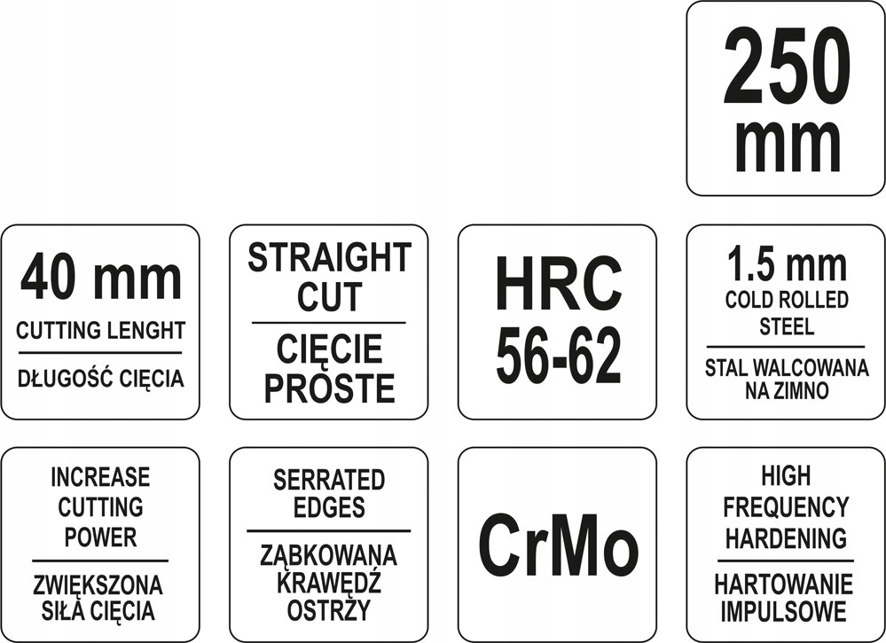 Ножиці для різання листового металу, ковані з хромомолібденової сталі. Корпус проходить індукційне загартування приблизно до 46-52 HRC, а ріжучі губки – до 56-62 HRC. Це дозволяє вільно різати сталеві листи товщиною до 1,5 мм Ручки ножиць покриті пластиковими накладками Поверхня оксидована, чорна. Загальна довжина 250 мм.