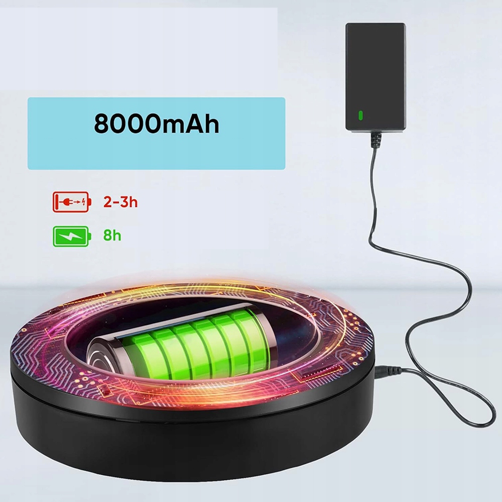 Електричний програвач має вбудований акумулятор на 8000 мАг, який може безперервно працювати протягом 8 годин після 3 годин повного заряджання. Під час фотографування та запису відео вам не доведеться турбуватися про кабелі живлення. Оснащений кабелем для заряджання UBS, заряджання дуже зручно та чудово підходить для використання на вулиці.