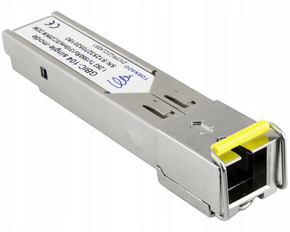 Модулі SFP (Small Form-factor Pluggable), які в народі називають GBIC (Gigabit Interface Converter), — це модулі, які перетворюють електричний сигнал на оптичний. Вставка GBIC-104 Tornado — це модуль, призначений для передачі через одномодовий режим волокна (SM) на відстані до 20 км. Довжина хвилі TX 1550 нм, довжина хвилі RX 1310 нм, швидкість передачі 1,25 Гбіт/с. Модуль має роз’єм SC із системою блокування на засувку для запобігання випадковому від’єднанню роз’єму.