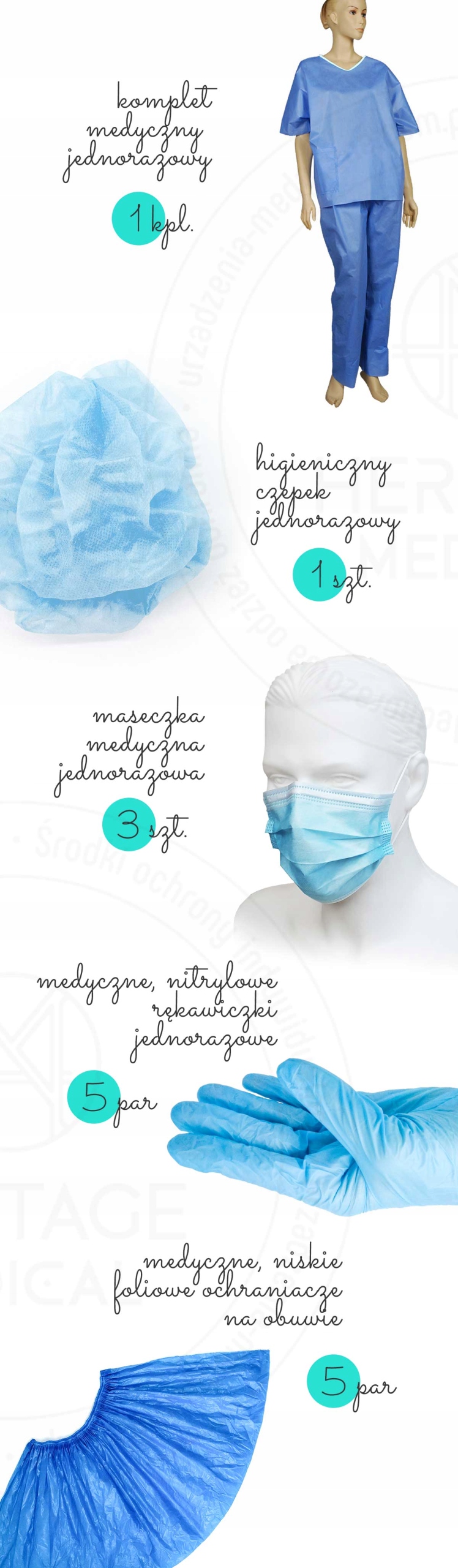 До складу набору входять: одноразовий медичний комплект з нетканого полотна СМС (блузка + штани), медична шапочка (1 шт.), хірургічна маска (3 шт.). ), рукавички нітрилові (5 пар), бахіли (5 пар).