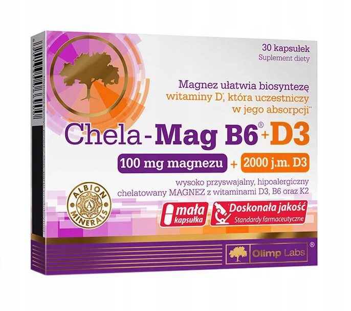 chela-mag b6 + d3 -дієтична добавка з унікальним комбінованим сильно поглиненим формою магнію у формі albion® амінокислотного хелату з вітаміном D3 у кількості 2000 р. Дж. М. та вітамінів B6 та K2.