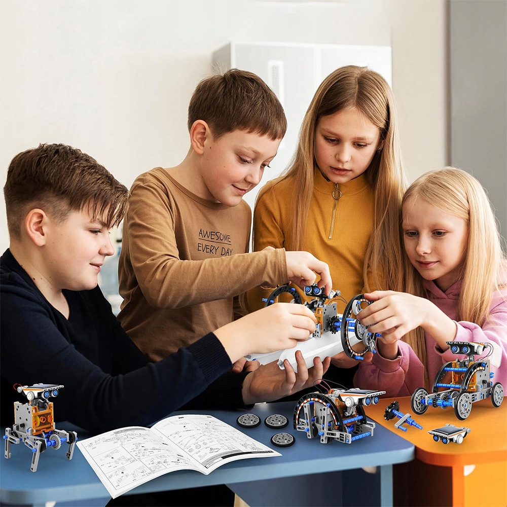 13 різних сонячних структурних роботів, які можуть рухатися по суші або воді, для самостійного складання дитиною. Два рівні складності: рівень початківців для дітей молодших та підвищений рівень для дітей старшого віку, щоб вони могли перевірити свої практичні навички.
