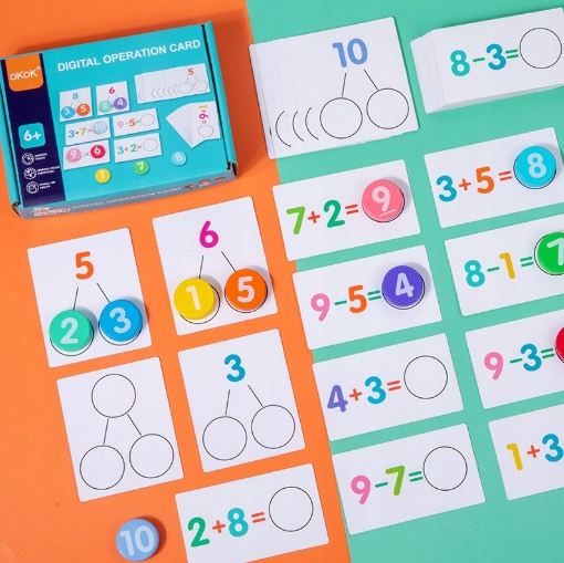 Набір включає барвисті картки та дерев’яні диски з цифрами, завдяки яким дитина може самостійно вирішувати прості математичні операції та розвивати навички логічного мислення.