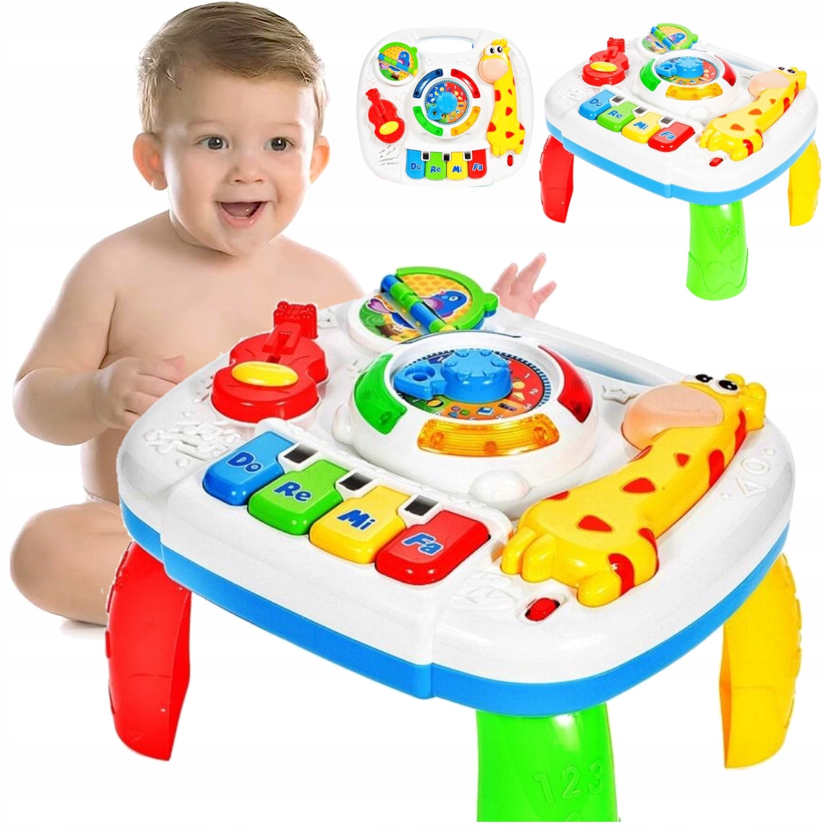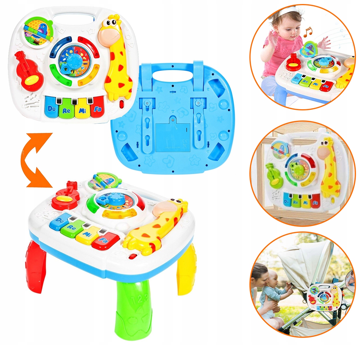 Стіл - чудовий ігровий центр для малюка, завдяки своїй різноманітності він довго не набридне. Стимулює моторний і зоровий розвиток дитини, спонукає до постійної активності. Багатофункціональний інтерактивний стіл допомагає вашій дитині розвиватися через гру - з музикою, світлом і кольорами. Можна використовувати як стіл або підвісну панель з регульованими тримачами для дитячого ліжечка.