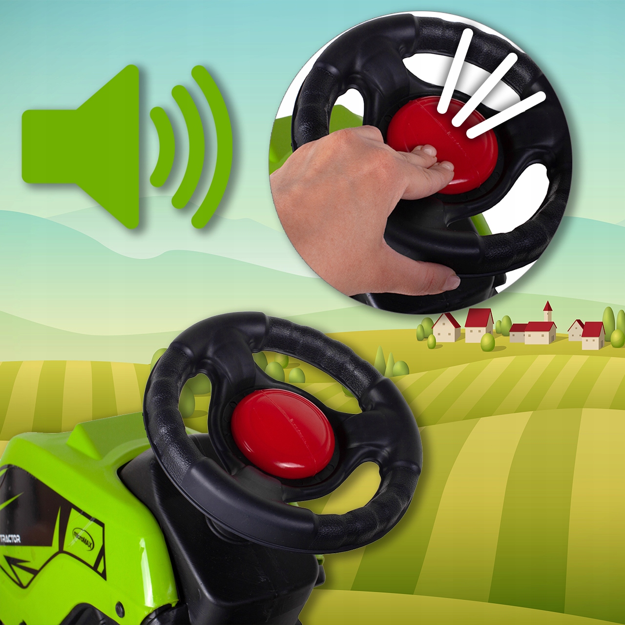 Сигнал — це велика червона кнопка посередині керма, яка при натисканні пищить, сповіщаючи оточуючих про наближення дитини.