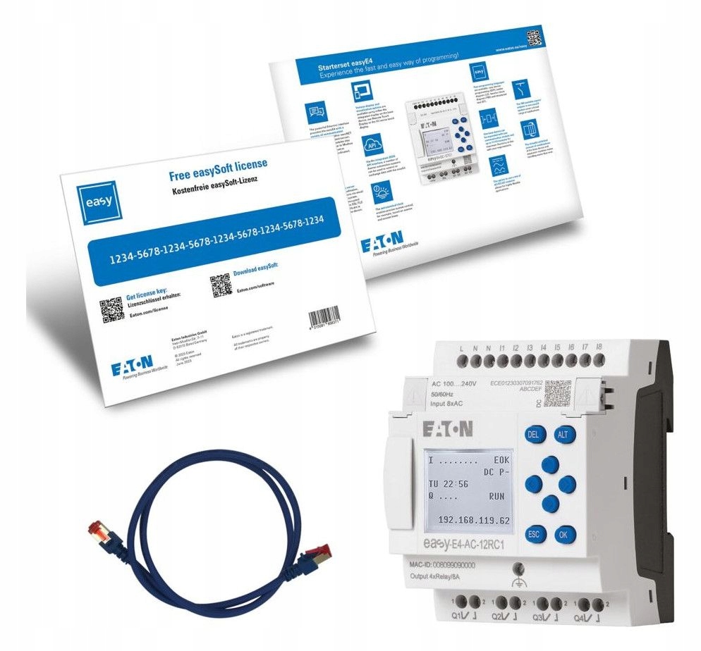 Стартерний пакет для легкого введення в технологію управління. Пакет стартера містить реле управління Easy-E4-AC-12RC1 з РК-дисплеєм та з'єднаннями через термінал Scorz, патч-кабель для підключення реле управління до інтерфейсу Ethernet та ліцензію на програмне забезпечення для програмного забезпечення Eastisoft 7.