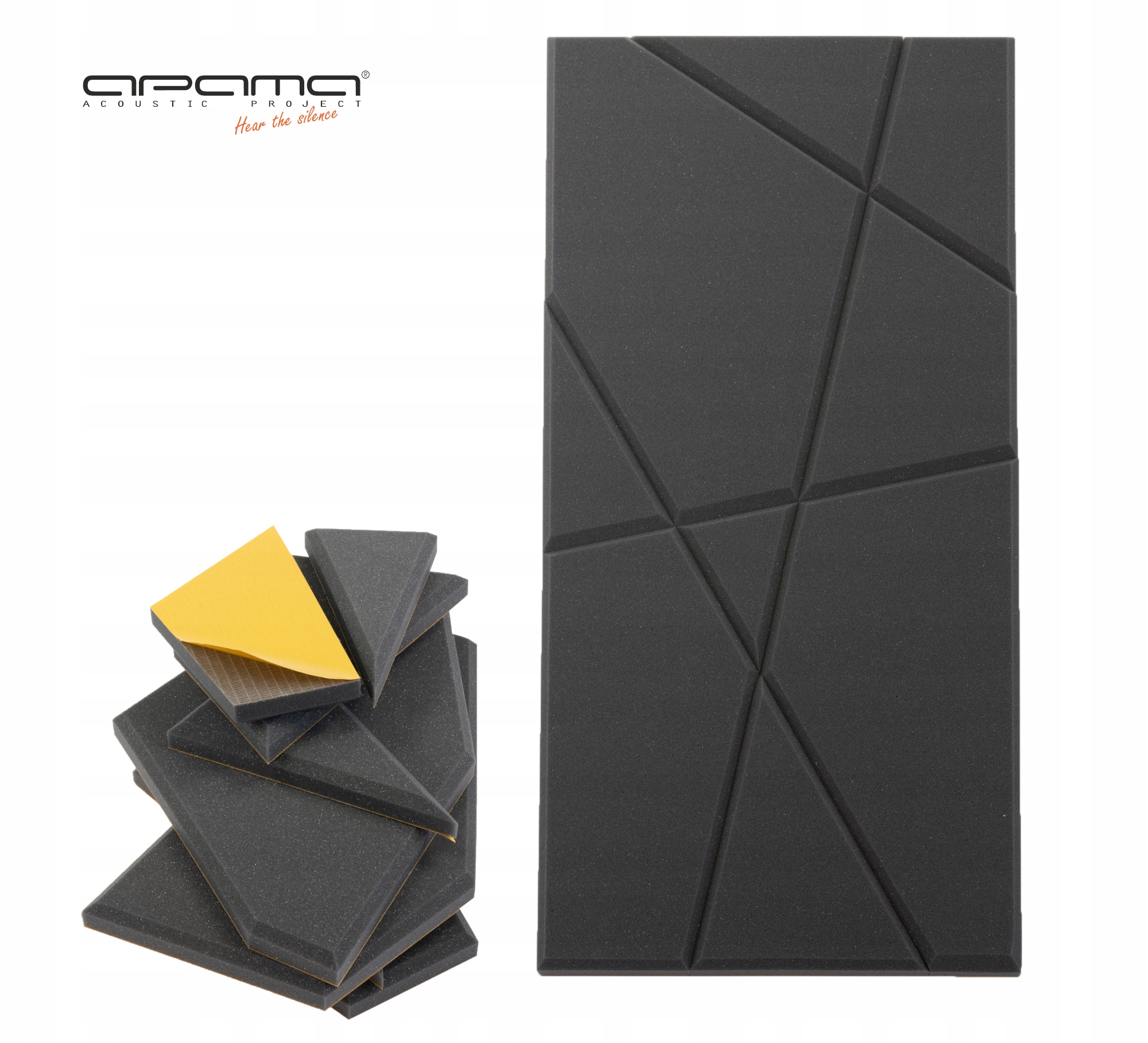 Ми пропонуємо вам оригінальну акустичну звукоізоляційну панель з діагональними краївами, що складається з дев'яти менших елементів нерегулярних форм, з самостійним шаром . Це ідеальне рішення для покращення якості звуку у вашій кімнаті!