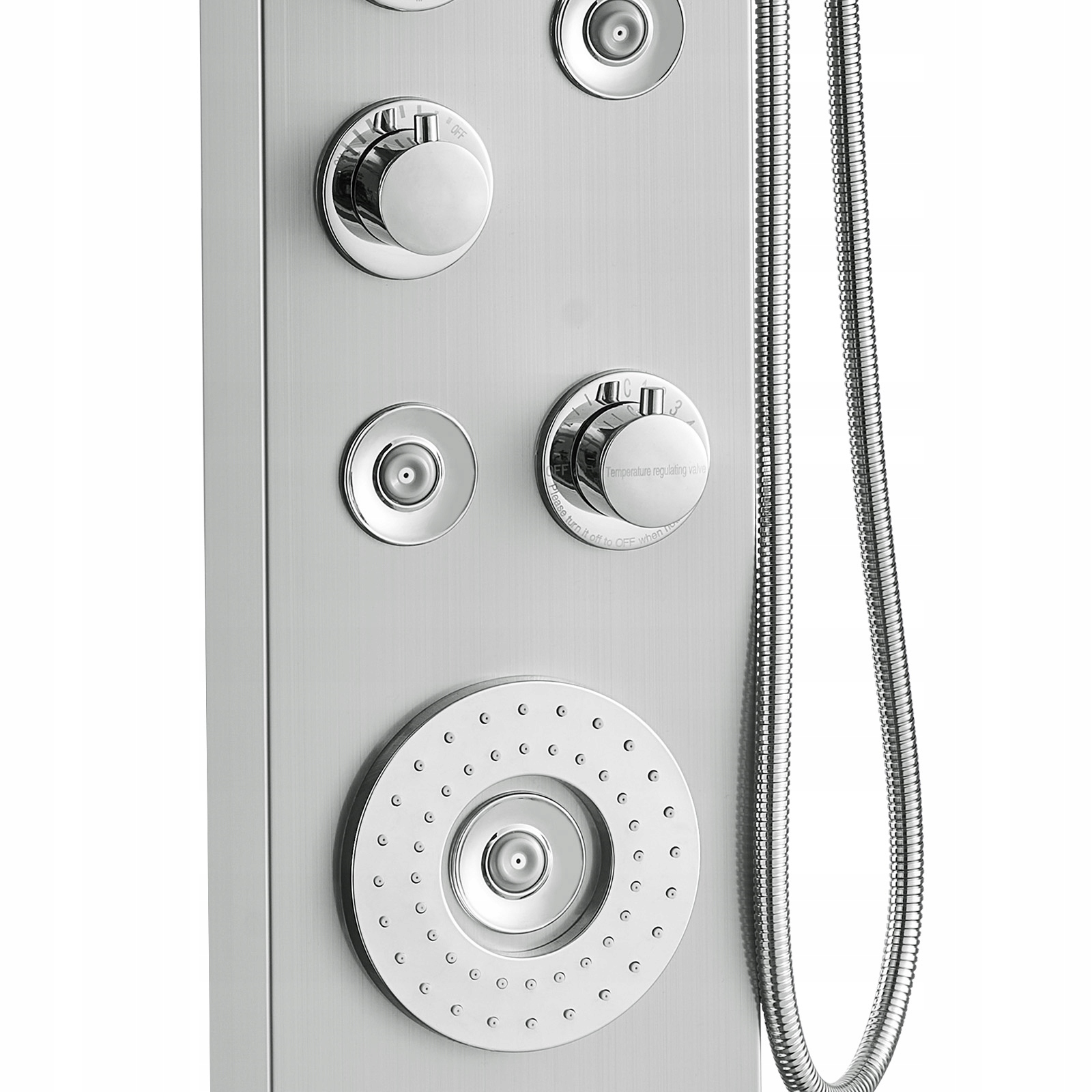 Наша душова панель виготовлена з потовщеної 304 листа з нержавіючої сталі, що забезпечує міцність і гігієну, стійкий до корозії та простий у чистці. Латунний змішувальний клапан та подвійна труба проти Bullion з ПВХ, а також плетена насадка з нержавіючої сталі 304 забезпечують тверду та щільну систему.
