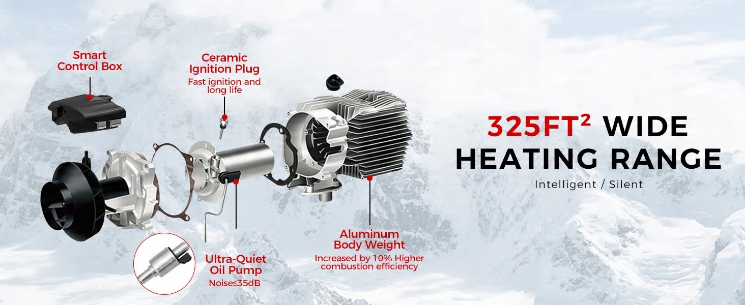 - Наша дизельна піч має потужність 8 кВт з ефективністю нагрівання ≥90%. Використовує лише 1 галлон дизельного палива на ніч, щоб підтримувати постійне тепло у великій площі 20 м². Він оснащений вбудованим інтелектуальним термостатом і вдосконаленим надтихим масляним насосом, що забезпечує низький рівень шуму ≤35 дБ, забезпечуючи комфортний сон у автофургонах і в кемпінгу на відкритому повітрі без перешкод, спричинених холодом.