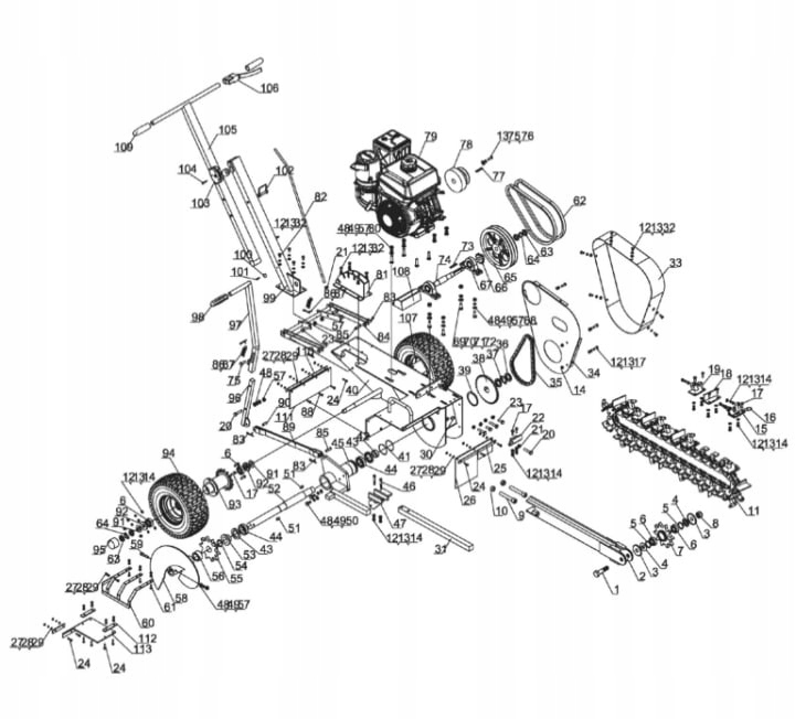 У нас є ряд різних запасних частин для ланцюгових екскаваторів, на сторінці ми надаємо складний креслення ланцюгового екскаватора з нумерацією деталей, які можна задати за допомогою Allegro "питання для продавця", надаючи частину, бренд, модель, розмірність.