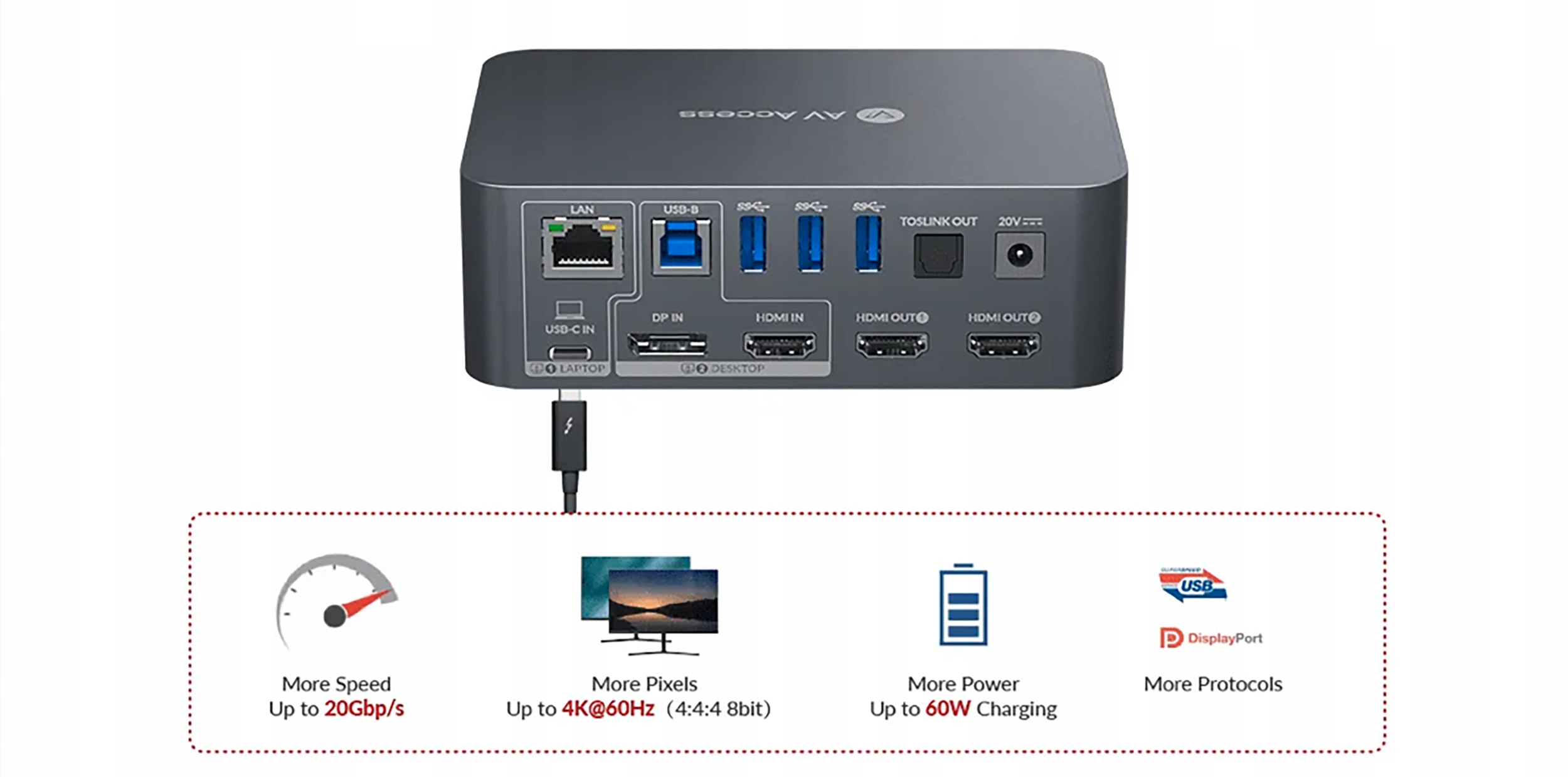 Повнофункціональний USB-C: за допомогою порту USB-C 20 Гбіт/с ви можете передавати подвійне відео 4K UHD і великі обсяги даних зі швидкістю до 5 Гбіт/с. Крім того, ви можете заряджати ноутбук потужністю до 60 Вт одночасно. Крім того, суміжний порт LAN може забезпечити доступ до Інтернету для вашого ноутбука.