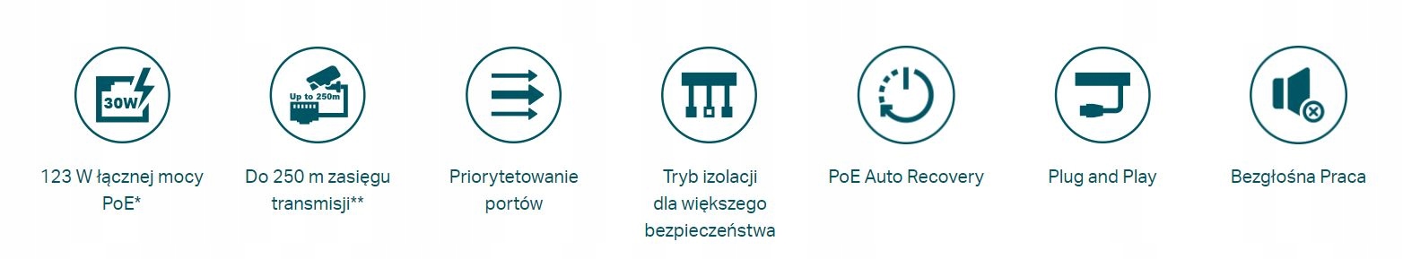 Сумісність із 802.3af/at Стандарт PoE+ забезпечує можливість запропонувати до 30 Вт потужності на кожному порту PoE. 123 Вт загального живлення PoE* комутатора, оснащеного 8 портами PoE+, є ідеальним рішенням, серед іншого: для систем моніторингу, офісів, гуртожитків та малого бізнесу. Пристрій повністю сумісний з IP-камерами, точками доступу, IP-телефонами, комп’ютерами, принтерами тощо.