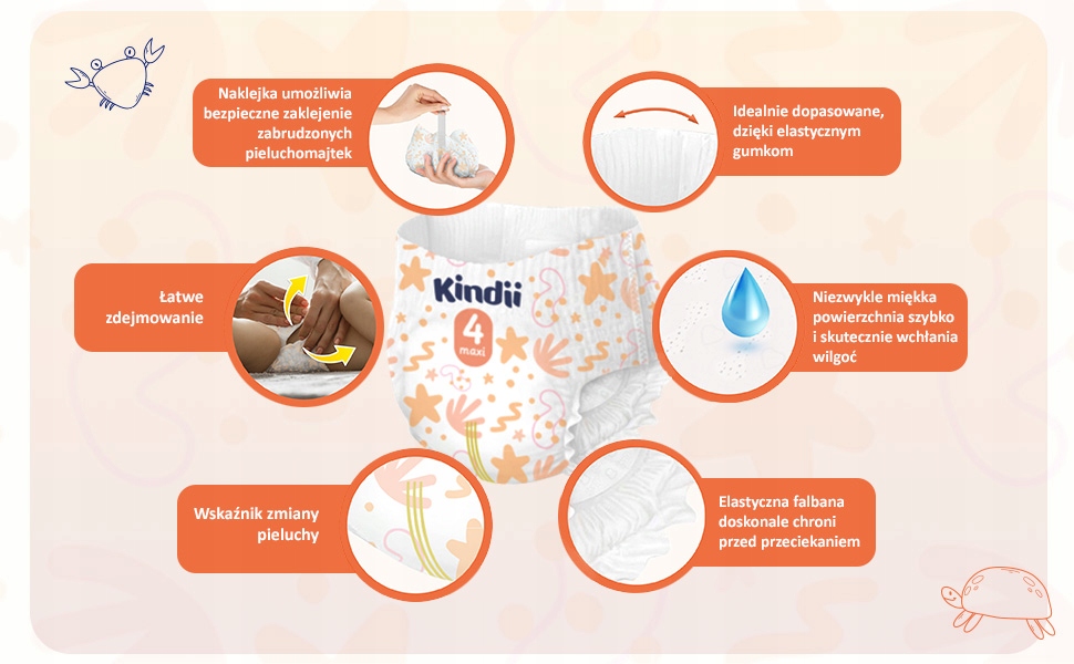 Kindii Pants забезпечують комфорт і безпеку для вашої дитини. Завдяки використанню інноваційних технологій підгузки легкі, м'які, дихаючі та не подразнюють чутливу шкіру малюка. Ідеально підходить для використання як вдень, так і вночі.