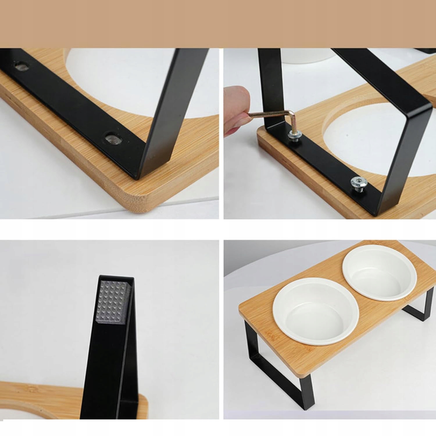 - Встановлення всього за три кроки: закрутіть металеву раму до бамбукової дошки, покладіть підставку на килимок, а потім покладіть чаші на карму.
