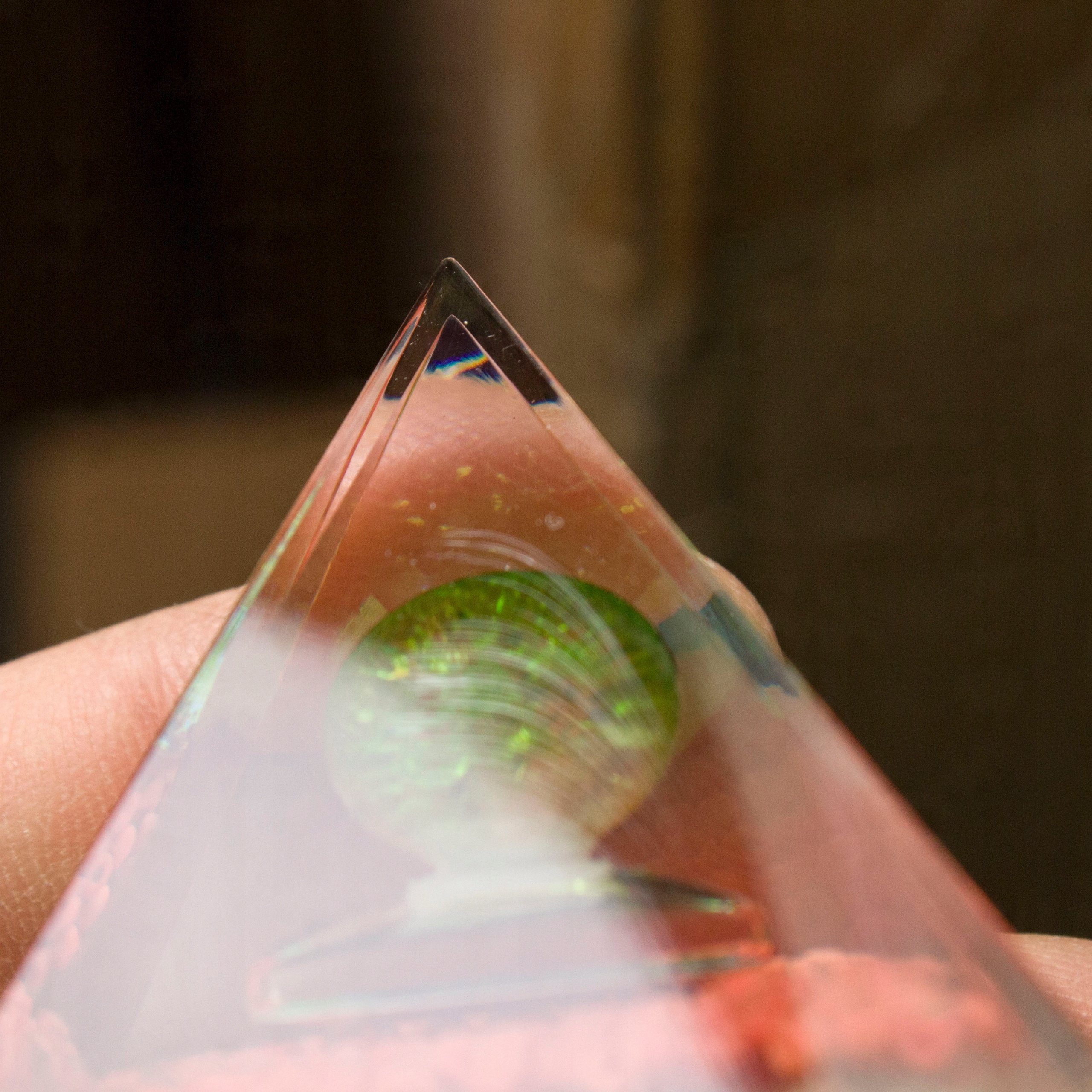 рожевий кристал , відомий своїми заспокійливими та гармонізуючими властивостями , вводить мир та емоційний баланс , заспокійливий стрес, страх і гнів. зміцнює почуття самолюбства та прийняття, відкриває серце любити і співчуття, стимулює творчість та інтуїцію, а також допомагає заснути і забезпечує добрий сон. 4 Мідь додатково покращує творчість та інтуїцію . 4 Діаметр (діагональ) основи становить близько 7 см. Висота піраміди становить близько 5 см.