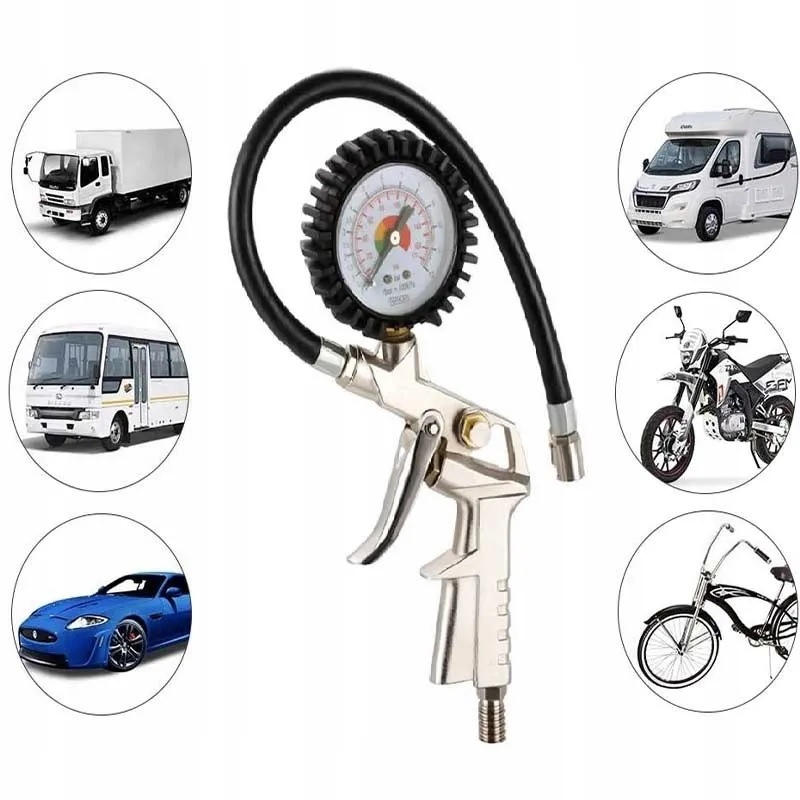 пістолет характеризується високою якістю. Оснащений точним манометром тиском з лусочками, собакою, укладеною гумою, що захищає його від пошкоджень. Вся структура міцна і стійка до пошкодження. Діапазон великого пальця - це спеціальний клапан, який дозволяє легко регулювати кількість повітря в шині. Ідеально підходить для будь -якого семінару, він також рекомендується для вулканізаційних заводів