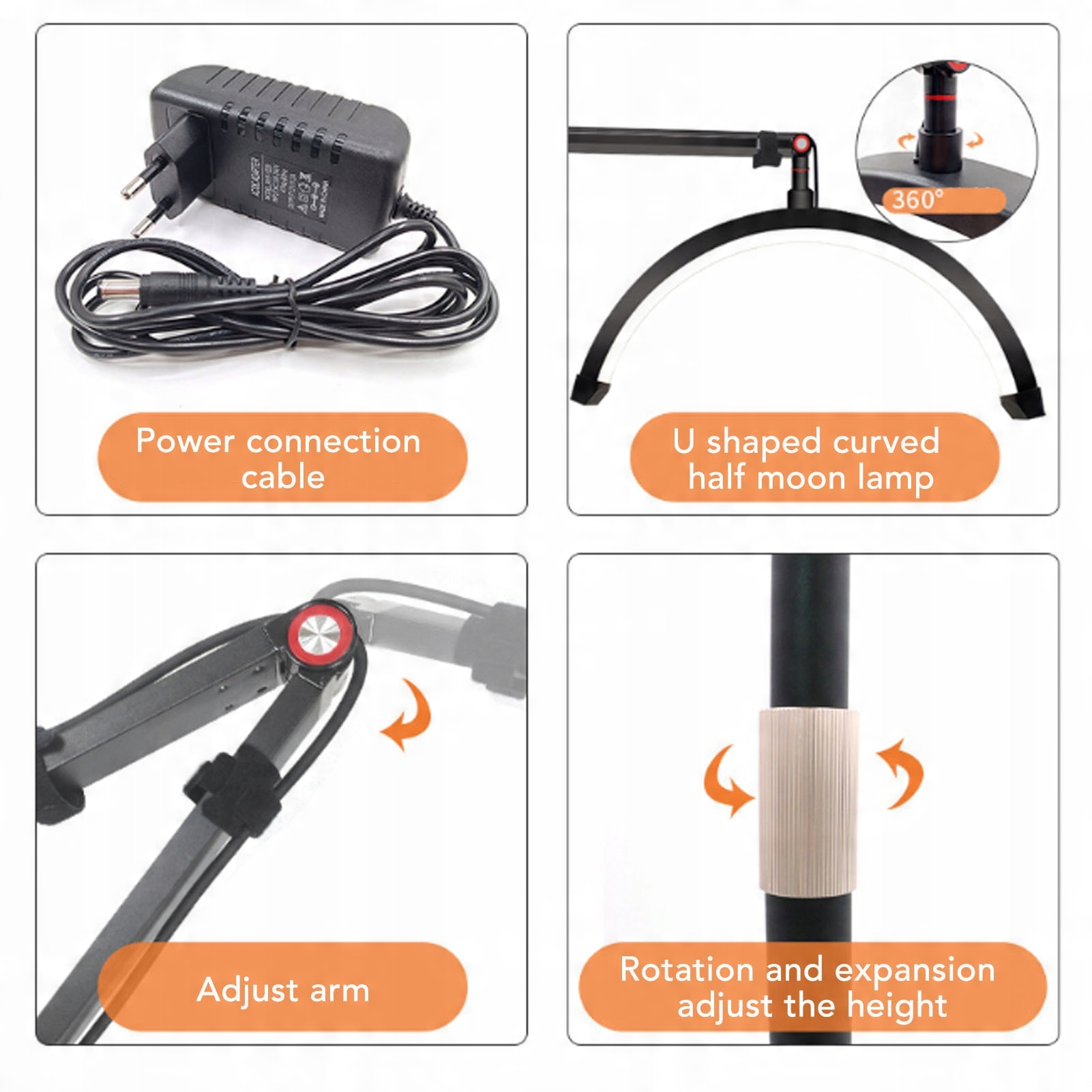 4. Легко для зберігання: знімний дизайн півмісяця полегшує збірку та зберігання, а також регульована висота та рука роблять її ідеальною для професіоналів, що стосуються косметики та татуювання, що працюють на різних висотах.