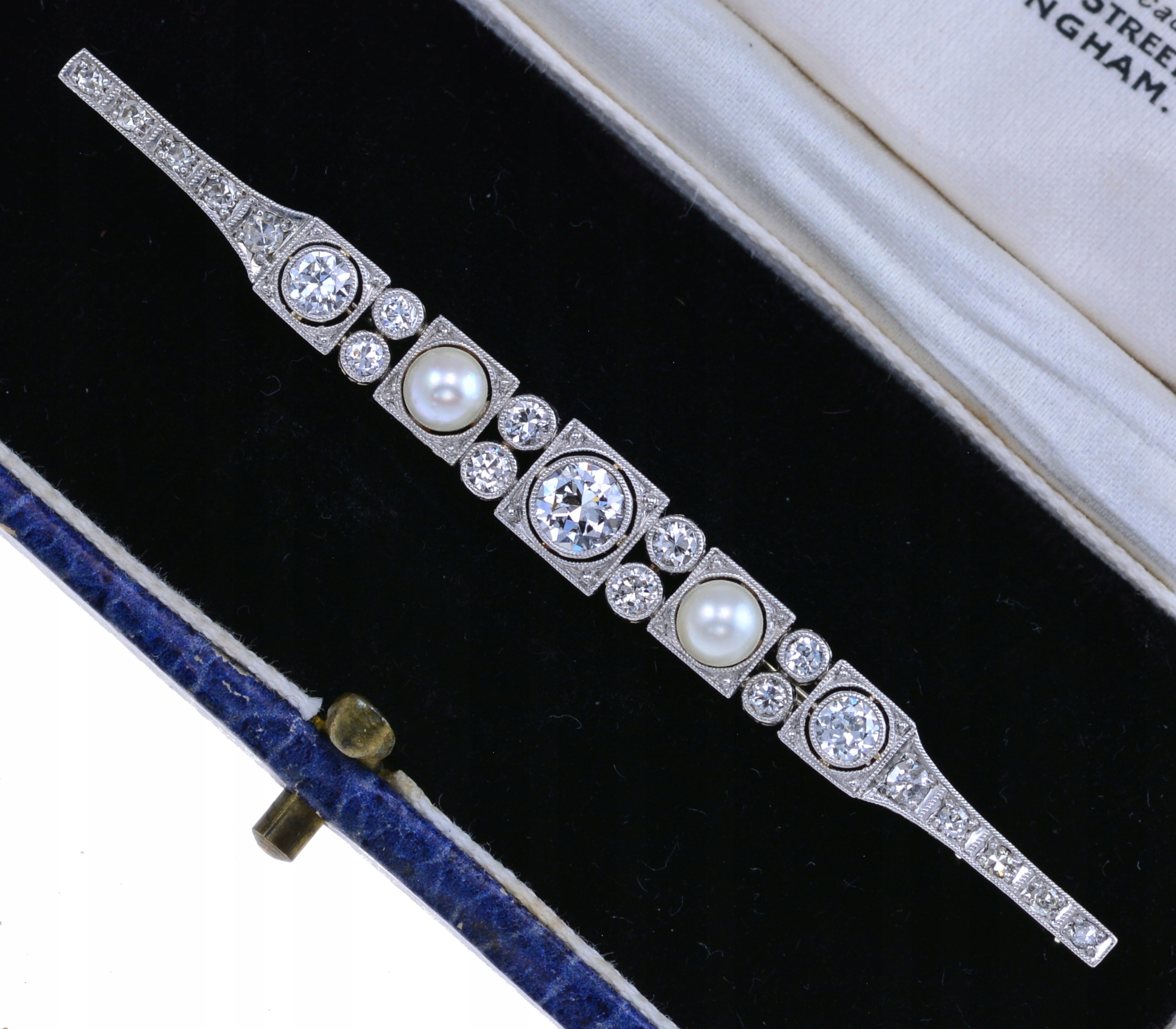 ПЛАТИНОВА БРОШКА АРТ-ДЕКО, ПЕРЛИНИ, БРИЛІАНТИ