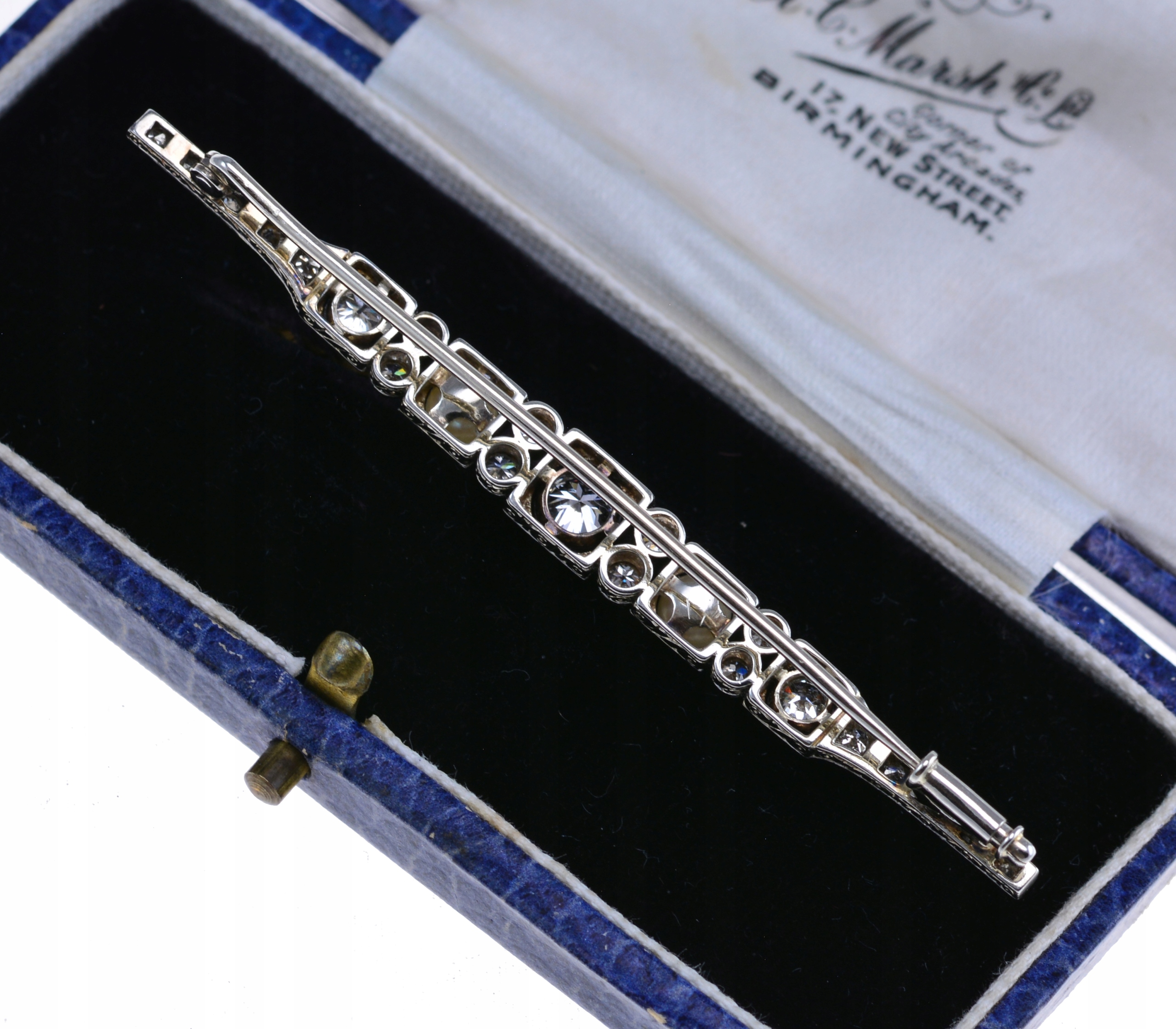 Предмет продажу - платинова брошка в стилі артдеко. Красиве мереживо старих ювелірних майстрів. Брошка оправлена діамантами старої огранки загальною вагою 1,02 карата та двома культивованими перлинами. Шпилька із золота 18 карат.