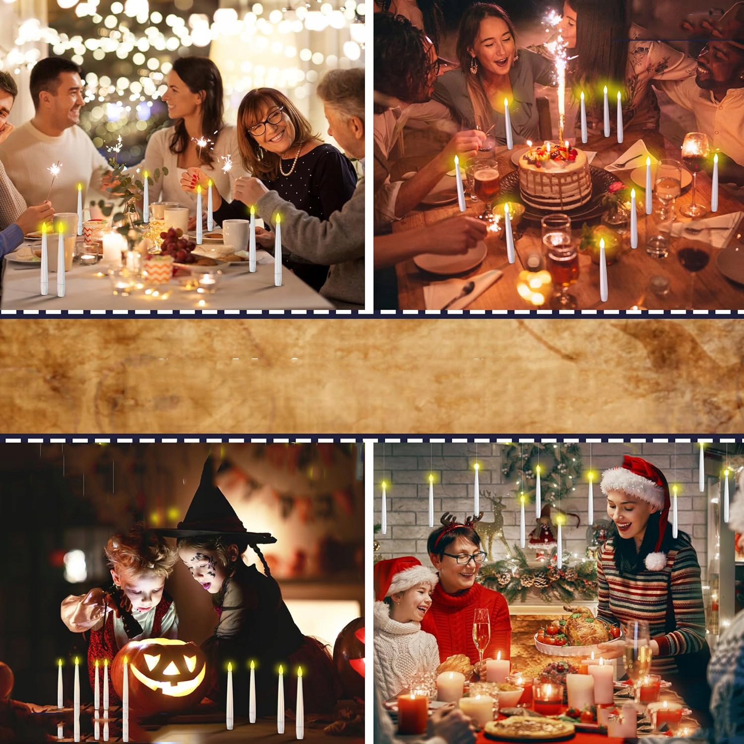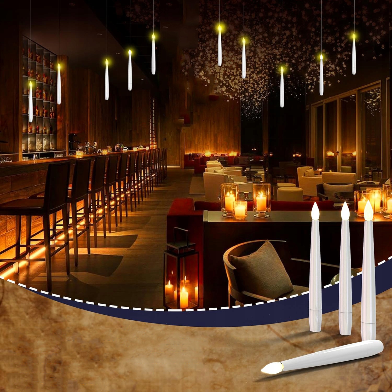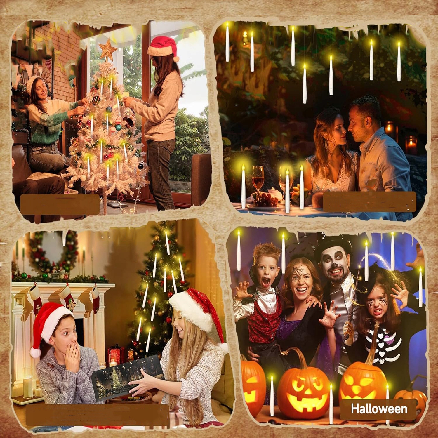Ці безполум’яні світлодіодні свічки постачаються з прозорим шнуром довжиною 50 футів (майже невидимим). Створіть свій власний чарівний простір за вашим бажанням. Підвісьте ці свічки до стелі або використовуйте гачки, щоб повісити їх на вікна, стіни або ялинку. Ідеально підходять як прикраси на Хеллоуїн, вони також підходять для камінів, обідніх столів і прикрас для дому та саду. Весела паличка дистанційного керування в поєднанні з плаваючими свічками створює чарівну атмосферу.