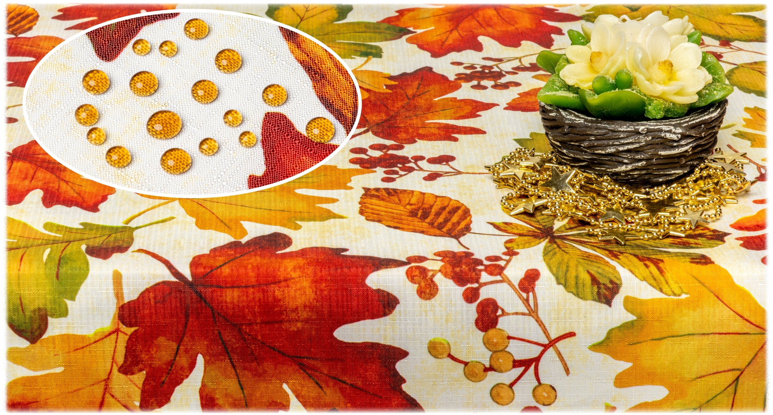 Скатертина має ПЛЯМЯСТІЙКЕ покриття (TEFLON FABRIC PROTECTOR), яке запобігає проникненню пролитої рідини в структуру скатертини.