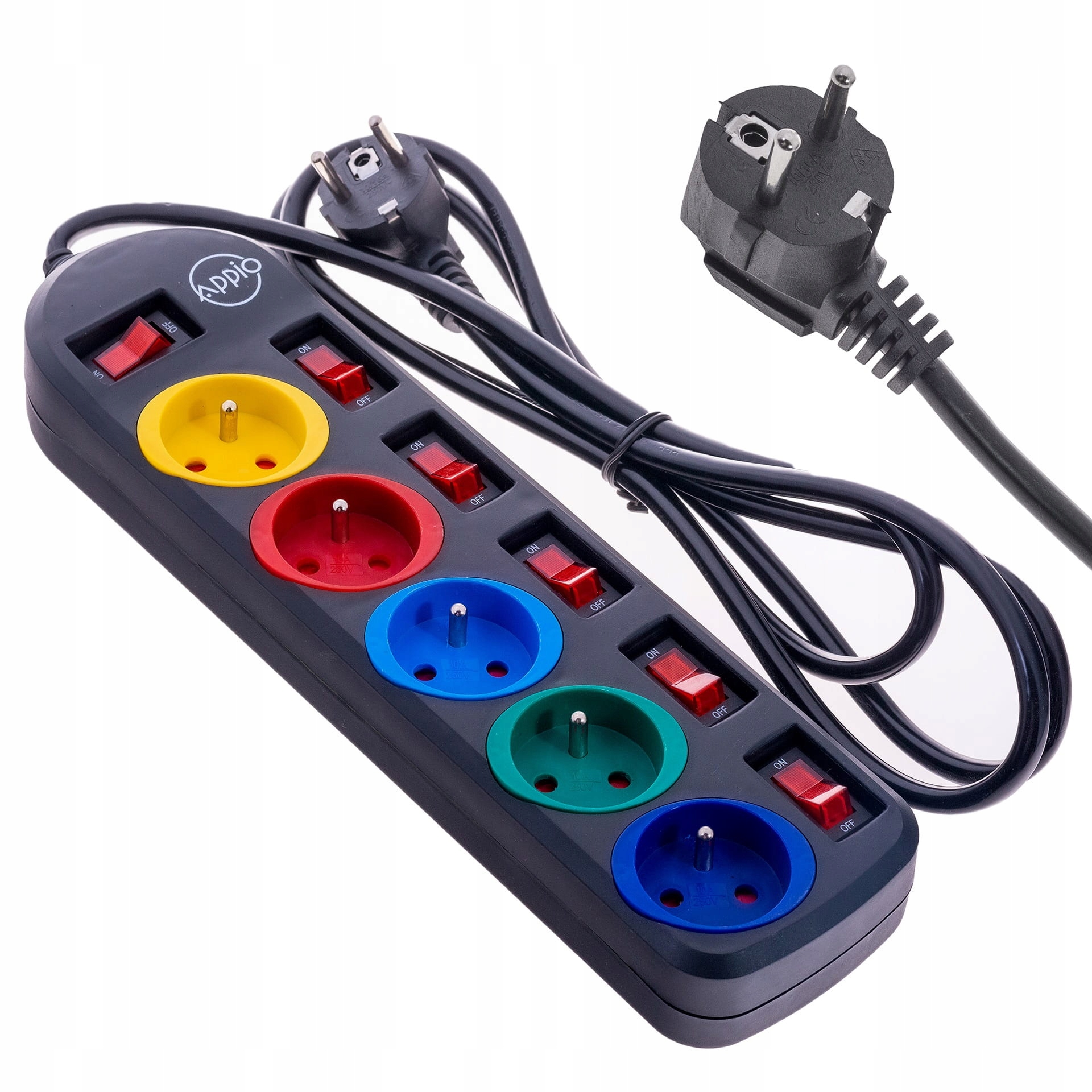 Кабель-подовжувач живлення APPIO з п'ятьма КОЛЬОРОВИМИ гніздами призначений для домашнього використання. Подовжувач дозволяє підключати пристрої, які знаходяться занадто далеко від електричної розетки. Подовжувач має 5 розеток, повернутих під кутом, і вимикач, з іншого боку знаходиться вилка під кутом.