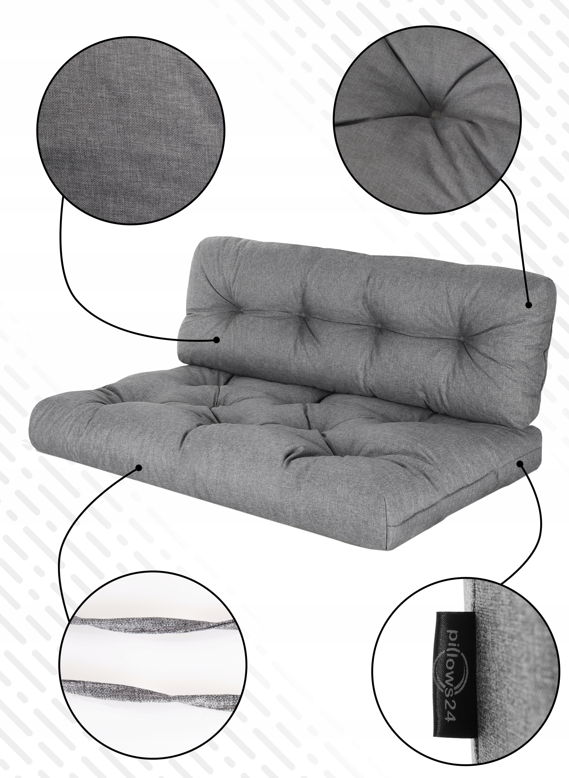 Подушки виготовлені з високоякісного матеріалу, що імітує льон. Матеріал характеризується високою стійкістю до стирання і механічних впливів. Він має водонепроникні властивості (не піддавайте його впливу води протягом тривалого часу). Подушки наповнені м'яким різаним поролоном для оббивки. Дві кріпильні стрічки в кожній подушці в колір матеріалу дозволяють надійно закріпити подушку на піддоні.