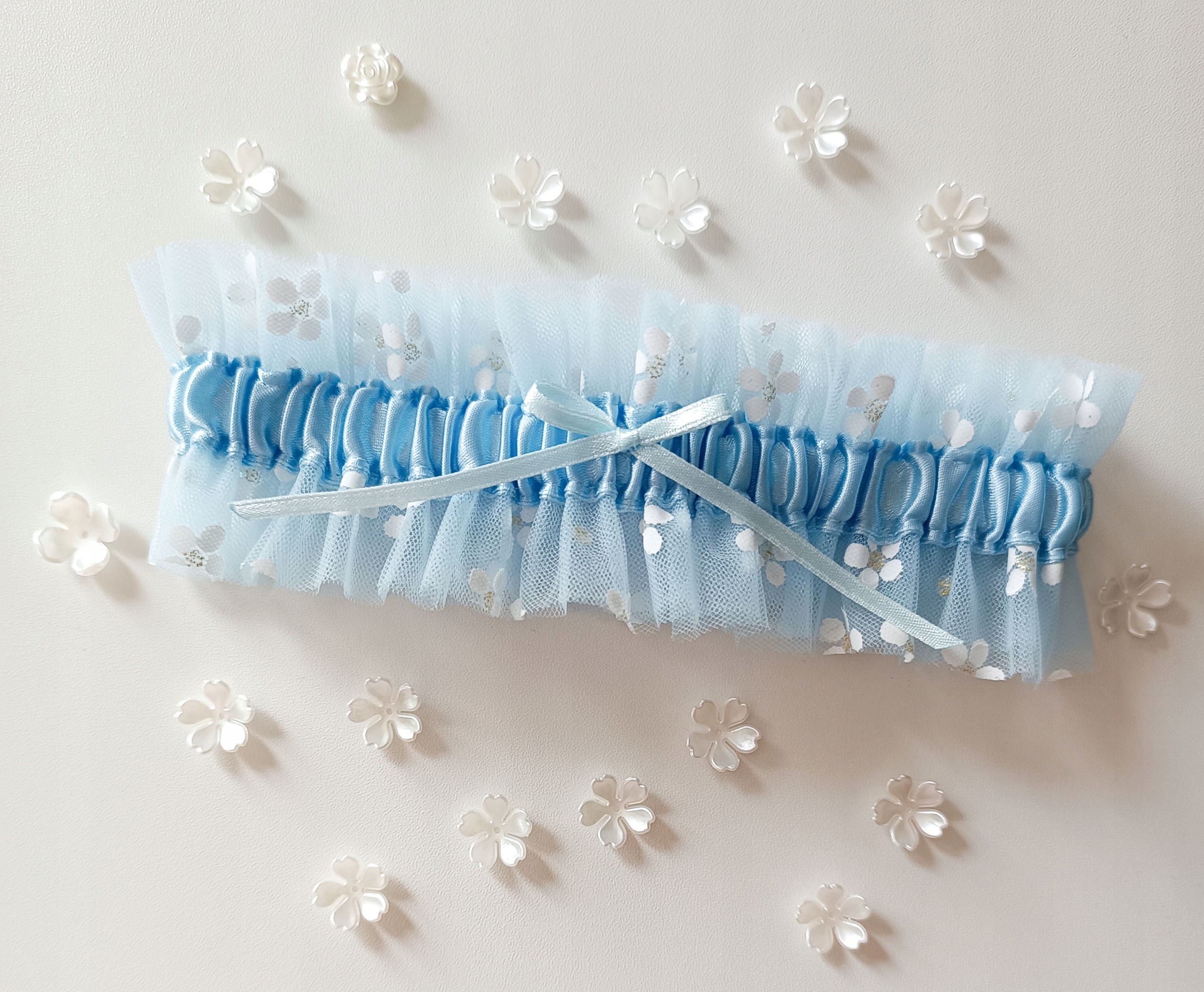 Podwiązka ślubna Lucy lux niebieska tiulowa kwiatuszki ekskluzywna NA MIARĘ
