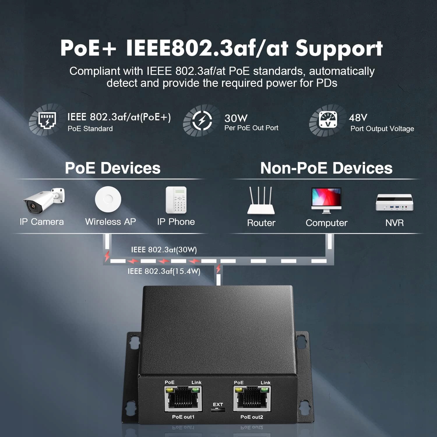 Поскарняний шнур Poe, 1 Poe in 2 Poe Out, IEEE802.3AF/AT POE, що працює на Poe, 10/100 Ethernet, металевий маленький настінний кріплення Poe Expresder/Injector/Extender Network