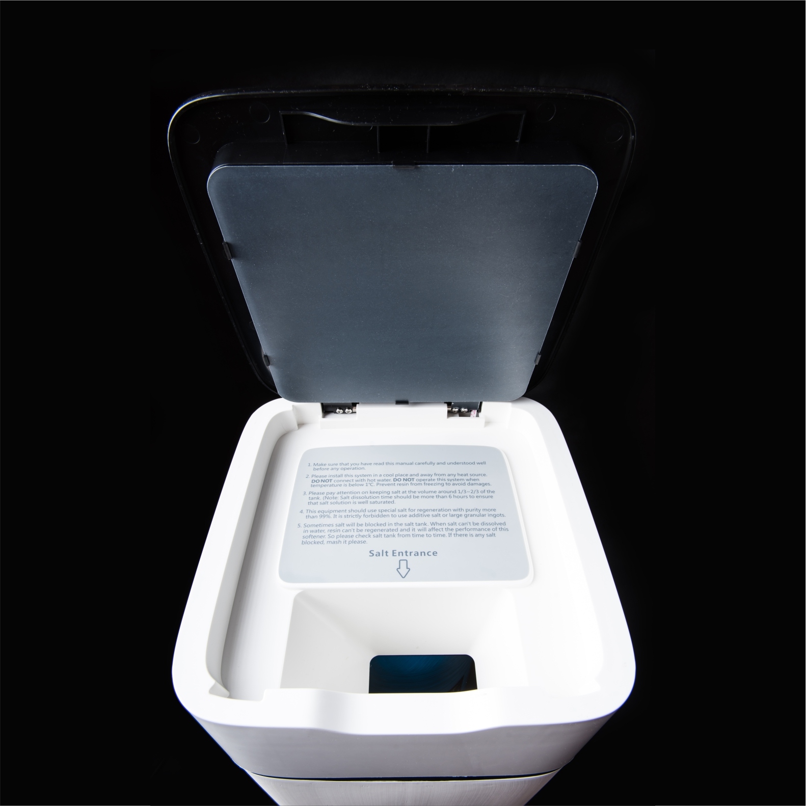 Кришка з керуючим комп'ютером відкидна. Коли ми це зробимо, ми побачимо вміло вбудований вхідний отвір для регенераційної солі. Цей розчин надзвичайно зручний у використанні, і завдяки цьому ми не забруднюємо весь пом’якшувач під час заправки таблеток солі.