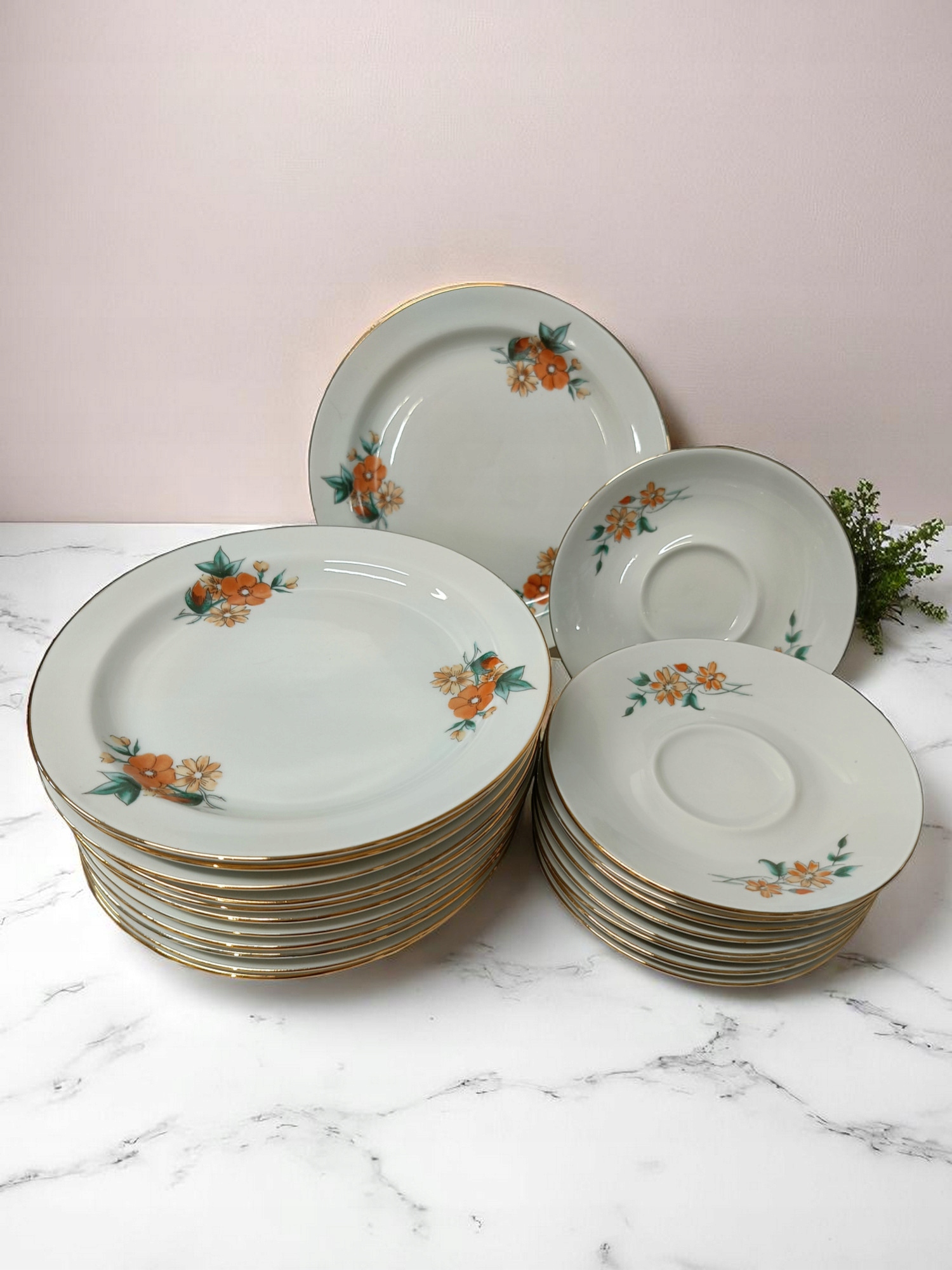 Класична порцелянова послуга від Wawel. Він характеризується ніжним білим порцеляном, прикрашеним квітковим акцентом та позолотою на краях.
