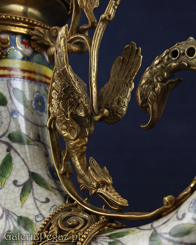 Все прикрашене бронзовою фурнітурою: крилаті дракони та ящірки, обличчя мудреця та коня, що прикрашають кришку чаші.