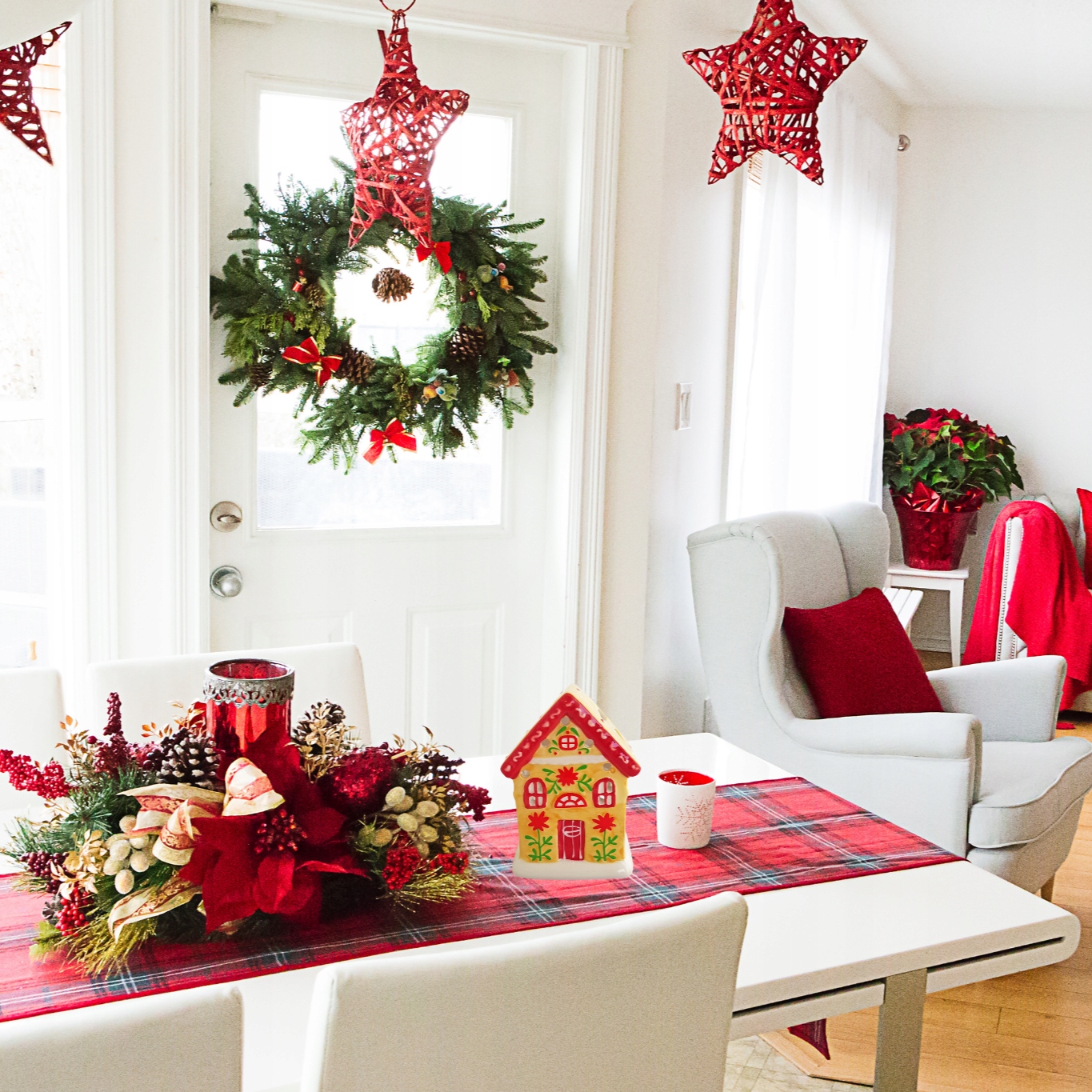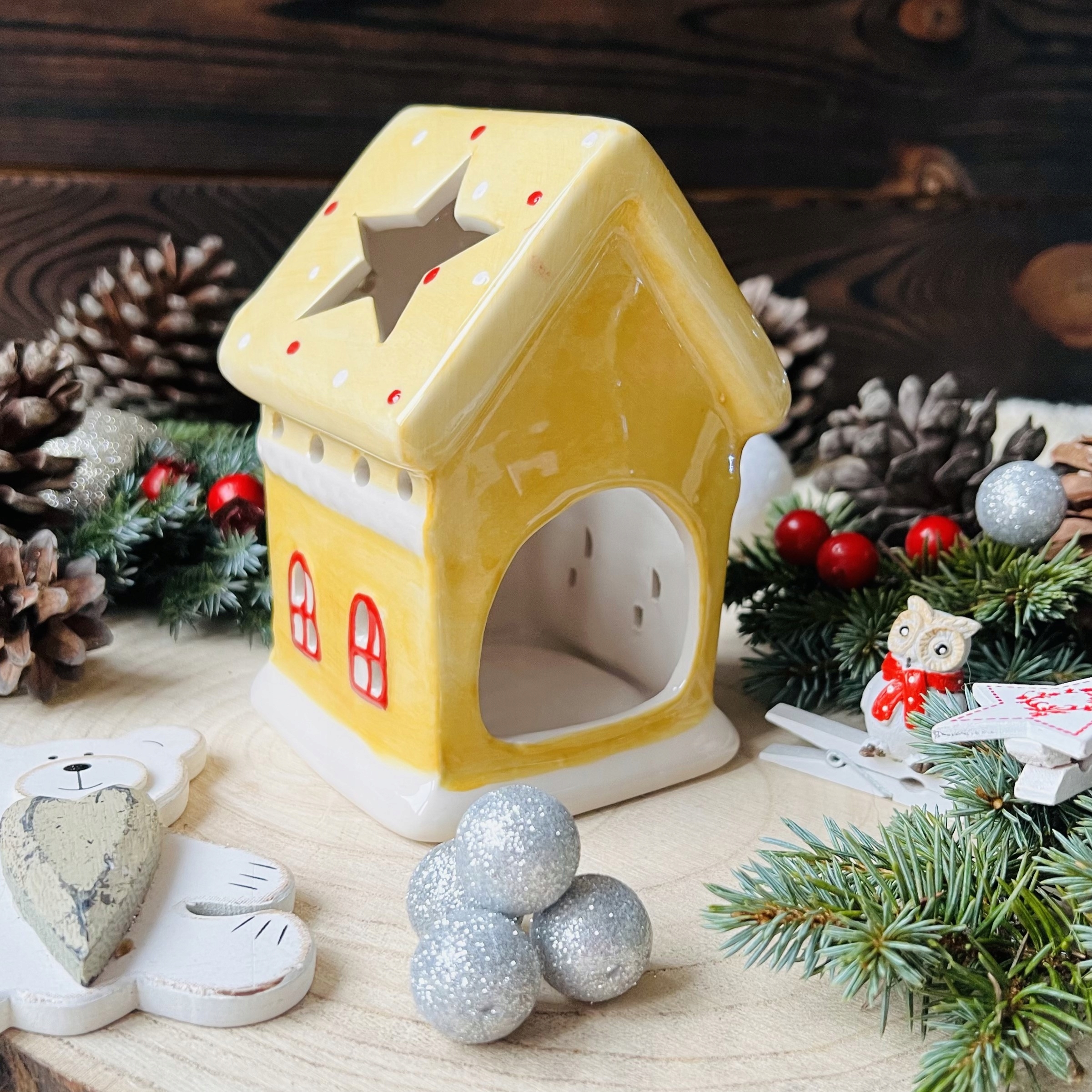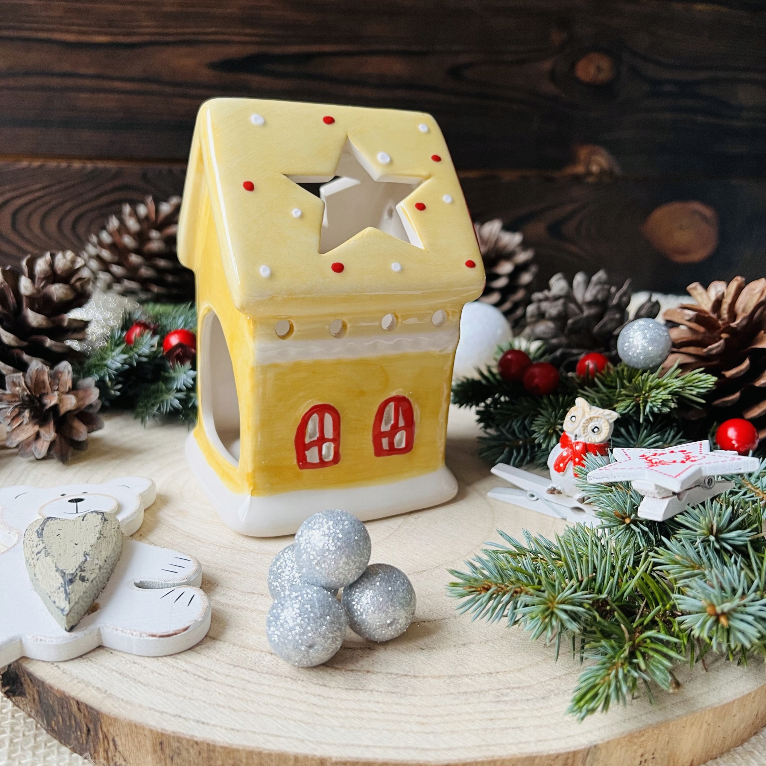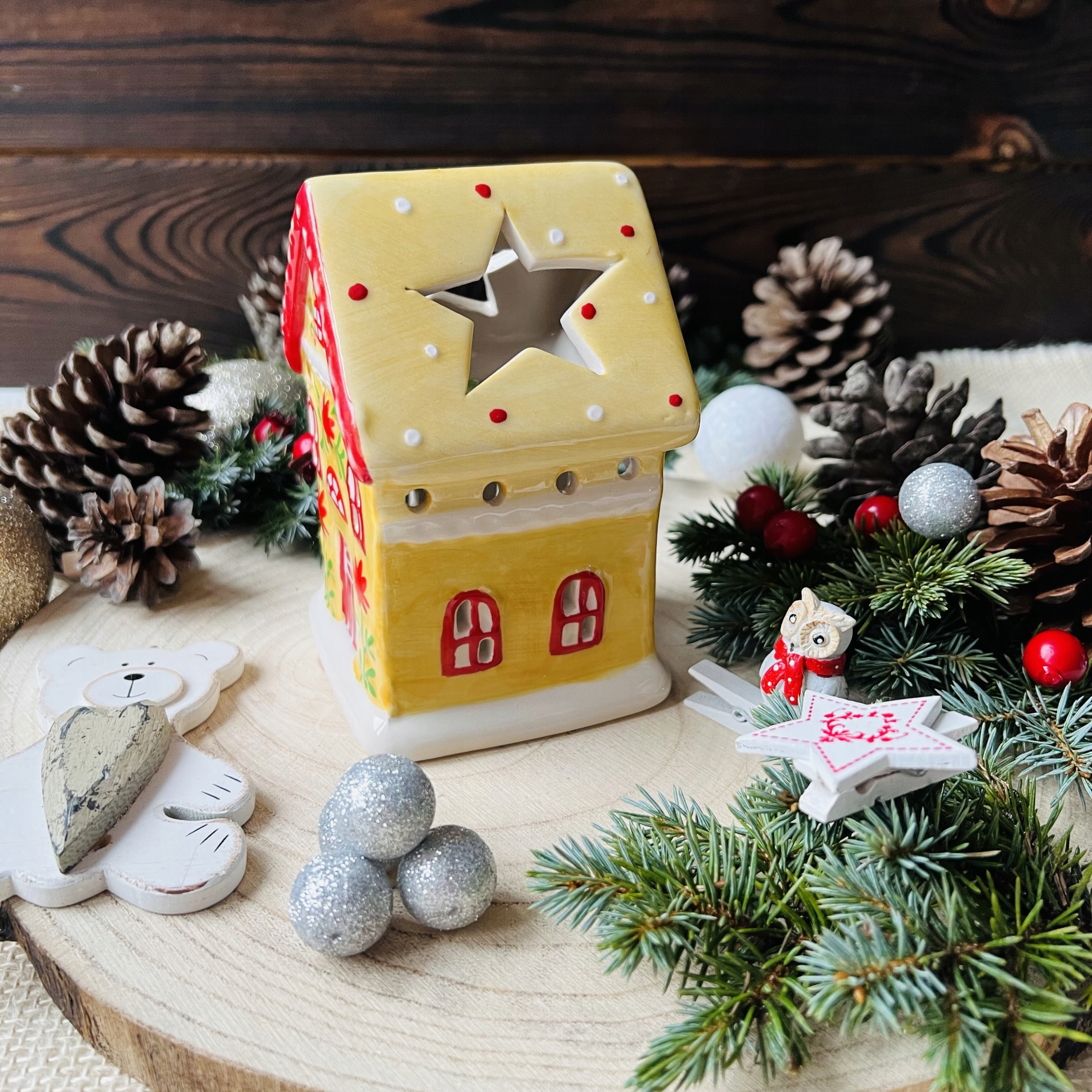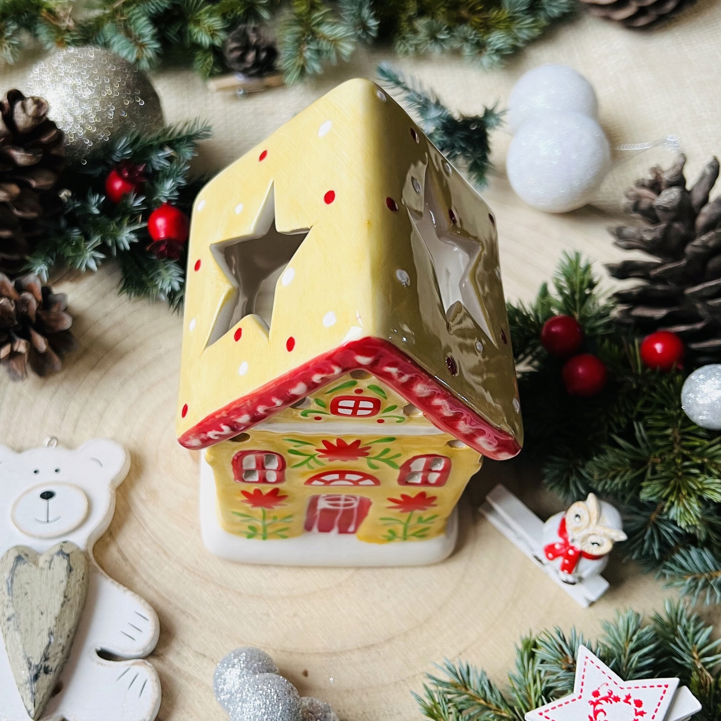 Пряниковий будиночок пастельно-жовтого кольору з червоними різдвяними мотивами випромінює різдвяний шарм. Зірки на даху підкреслюють унікальний і традиційний дизайн.
