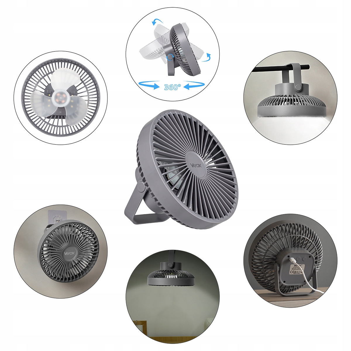 Завдяки практичній підставці вентилятор можна розмістити або підвісити, що робить його надзвичайно універсальним. Його легкий і мобільний дизайн робить його ідеальним вибором як для дому, офісу, так і на природі - на пляжі, пікніку, терасі чи кемпінгу.
