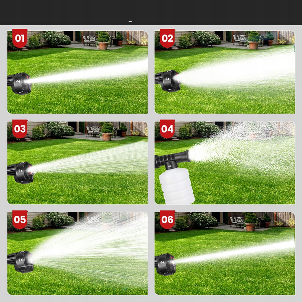 Портативна автомобільна мийка високого тиску оснащена регульованою насадкою 6-в-1, яка дозволяє ви можете легко перемикати інтенсивність струменя (0°, 15°, 25°, 40°, режим вентилятора та режим душу).