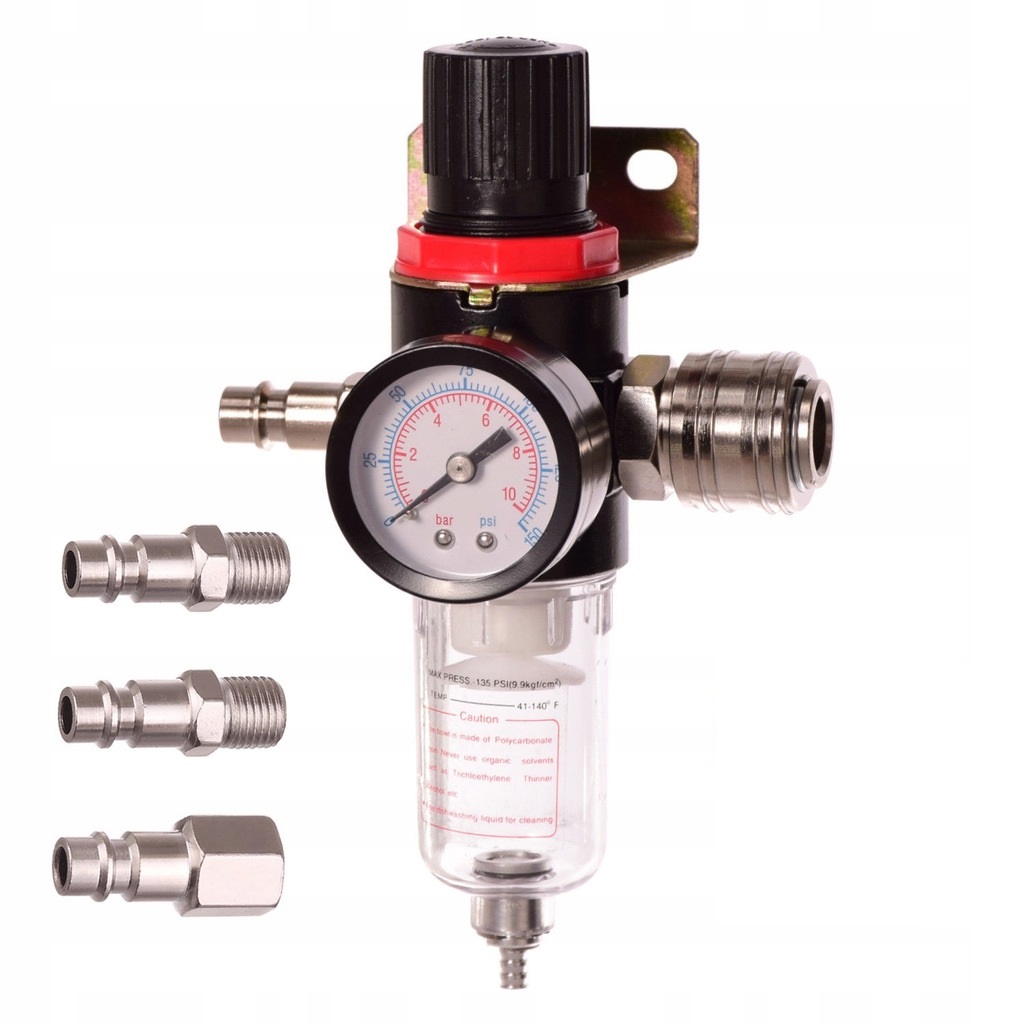 РедукторСиндром фільтра з редуктором забезпечує повний контроль над якістю повітря. Мавтор тиску з манометром дозволяє регулювати тиск у системах стисненого повітря. Дренаж, що містить сепаратор води, очищає стиснене повітря вологи, олії, конденсату та твердих частинок. Він фільтрує стиснене повітря з крапель води, що спричиняє плями під час малювання або корозії інших інструментів. Дегідрат корисна для пневматичних пристроїв (ключі від удару, шліфувальні машини, полірування, свердла тощо)