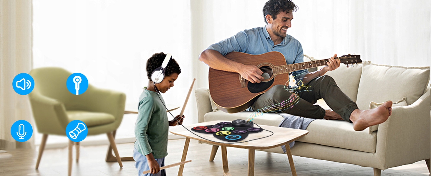 - 🎶 Електронний барабан з 9 реалістичними ударними звуками: 3 обсяги, 2 аварійні таблички, 1 Hi-Hat, 1 проїзні таблички, 1 сербель та 1 бас.
